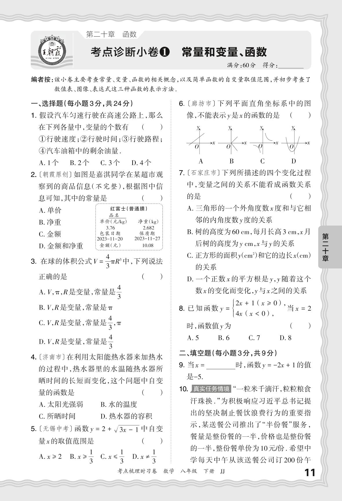 2024春下册八年级数学冀教版 第二十章 考点诊断小卷 常量和变量、函数【1】