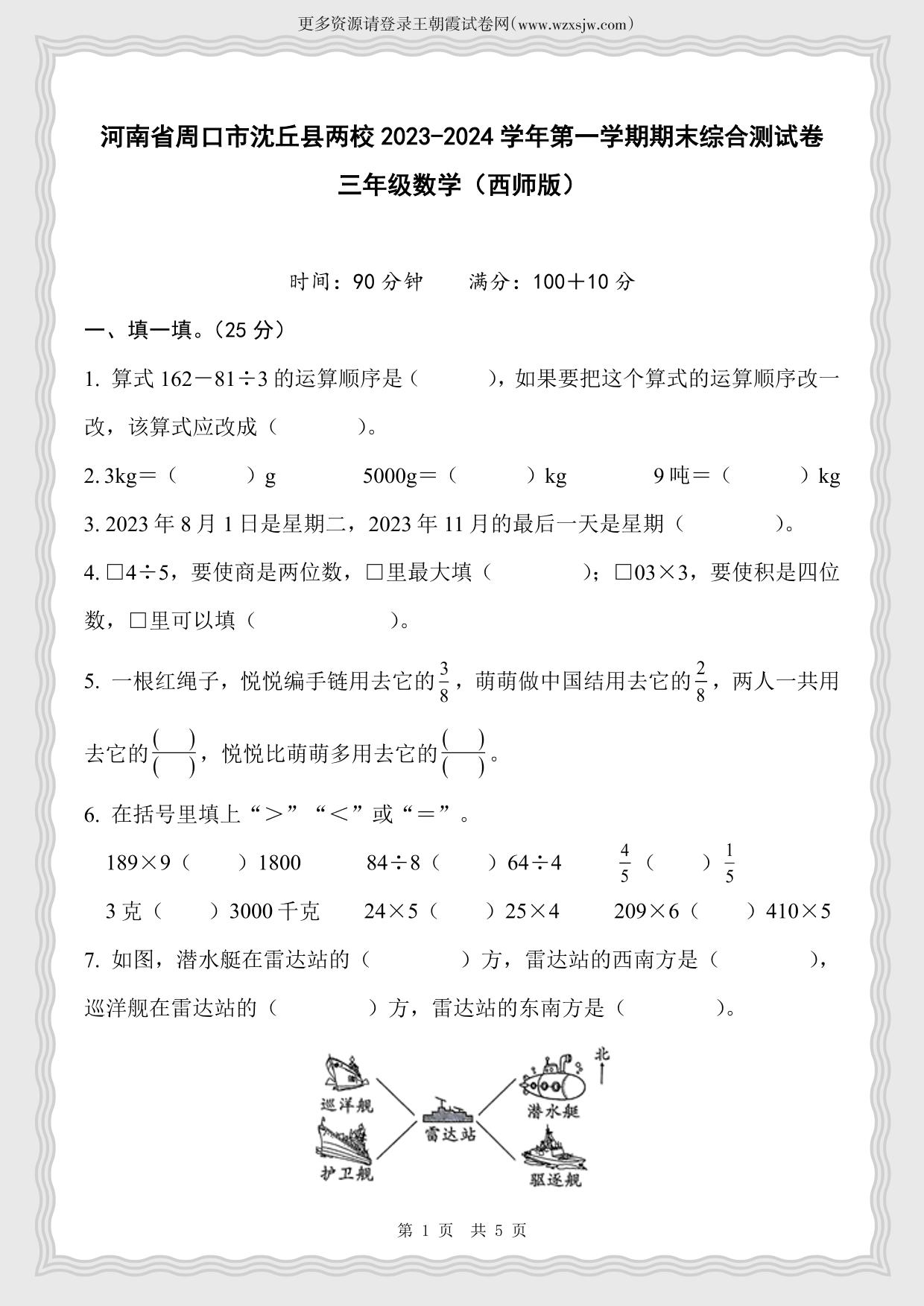 河南省周口市沈丘县两校2023-2024学年第一学期期末综合测试卷三年级数学(西师版)