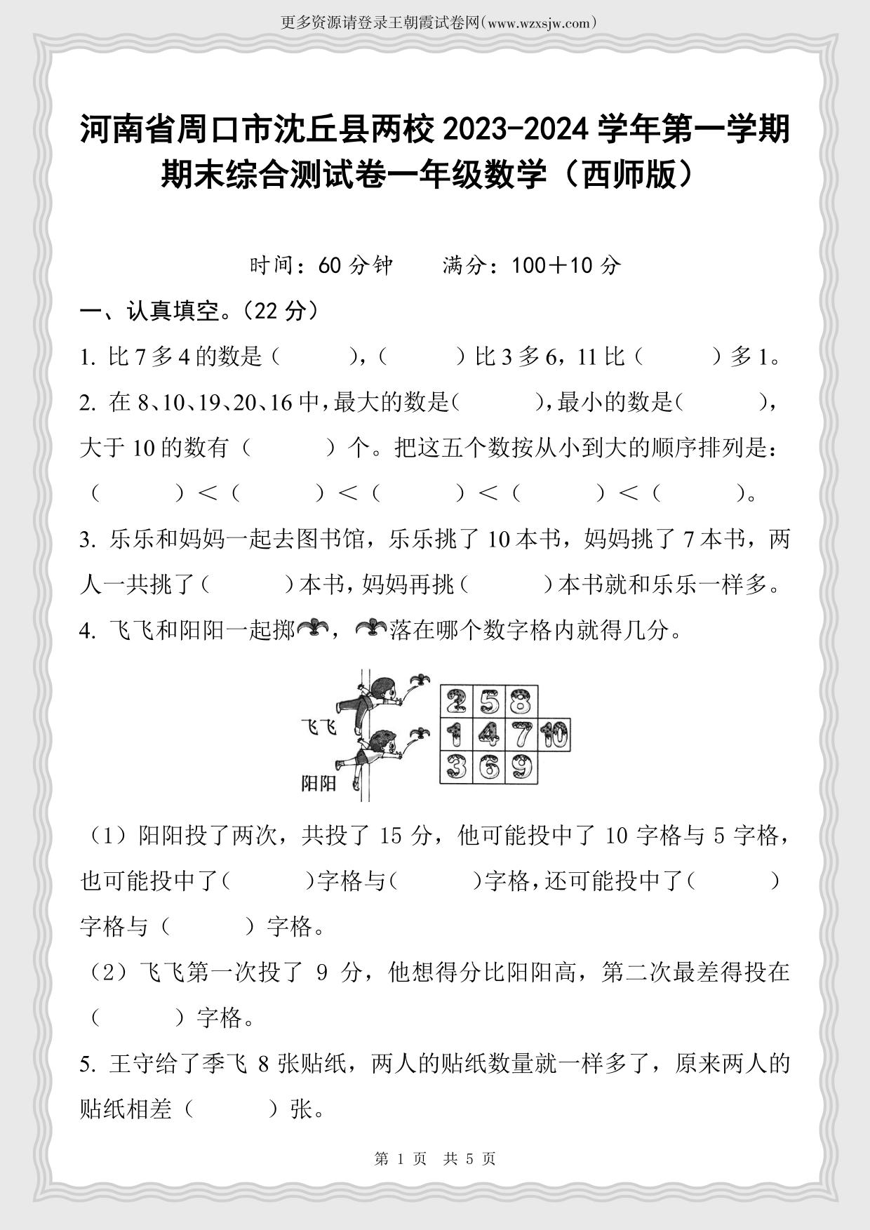 河南省周口市沈丘县两校2023-2024学年第一学期期末综合测试卷一年级数学(西师版)