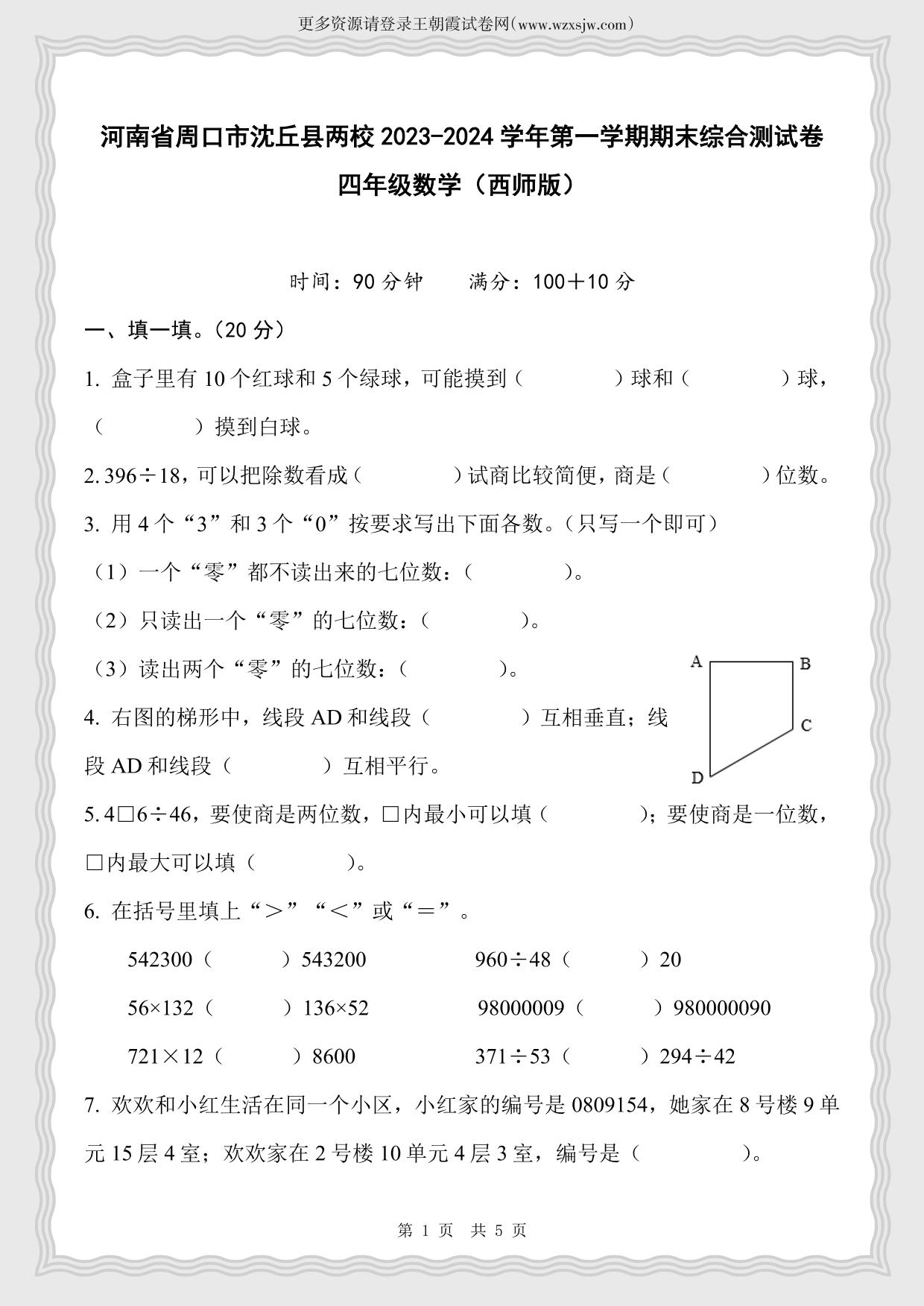 河南省周口市沈丘县两校2023-2024学年第一学期期末综合测试卷四年级数学(西师版)