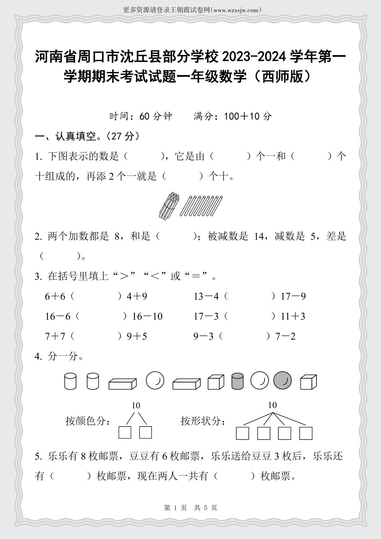 河南省周口市沈丘县部分学校2023-2024学年第一学期期末综合测试卷一年级数学(西师版)