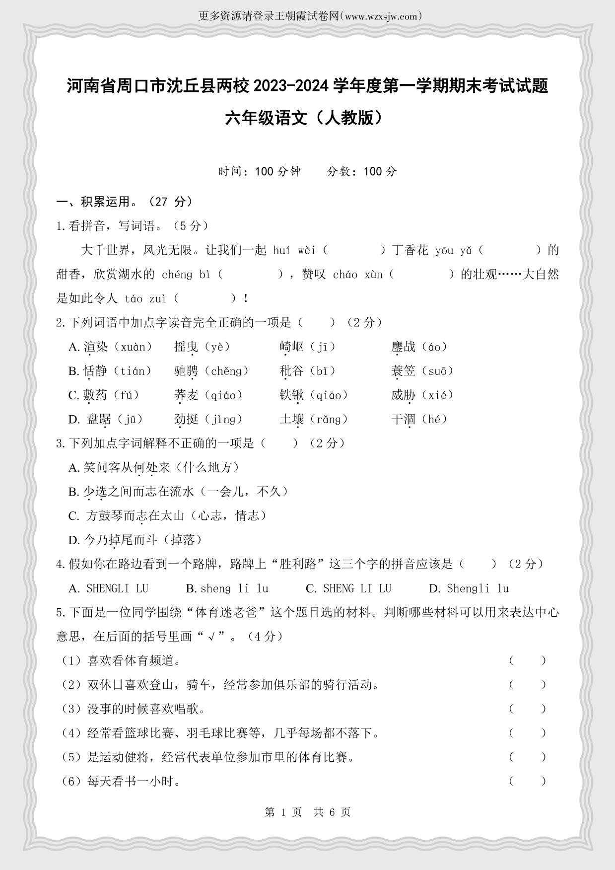 河南省周口市沈丘县两校2023-2024学年度第一学期期末考试试题六年级语文(人教版)