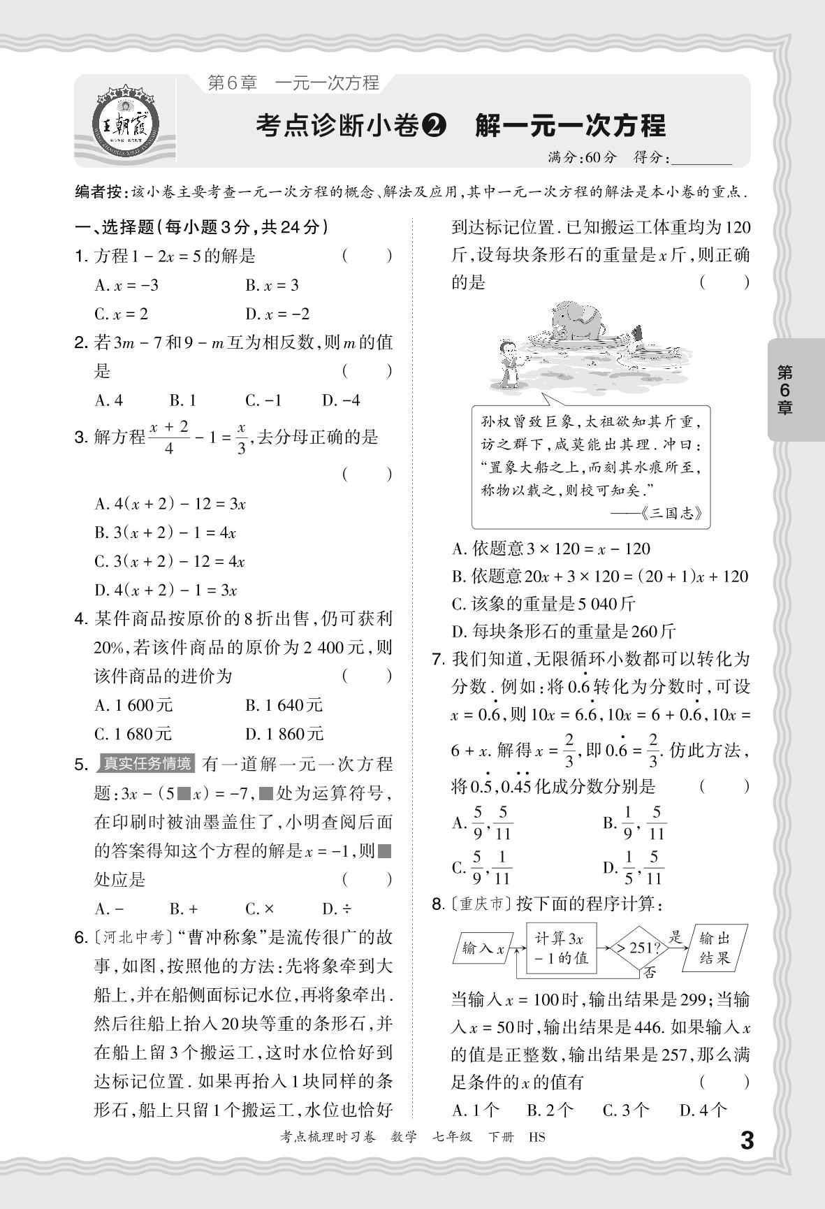 2024春下册七年级数学华师版 第6章 考点诊断小卷 解一元一次方程【2】