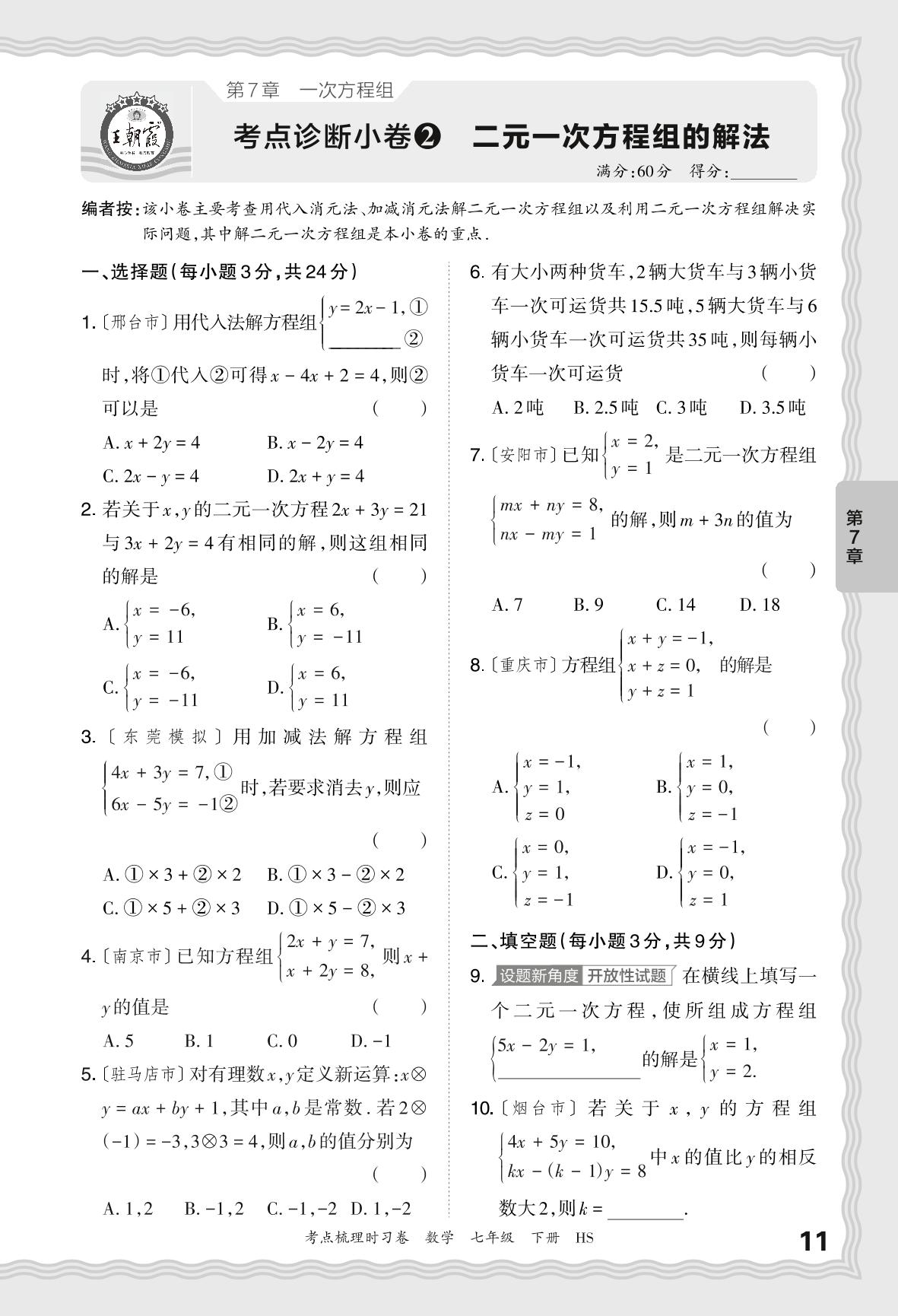 2024春下册七年级数学华师版 第7章 考点诊断小卷 二元一次方程组的解法【2】