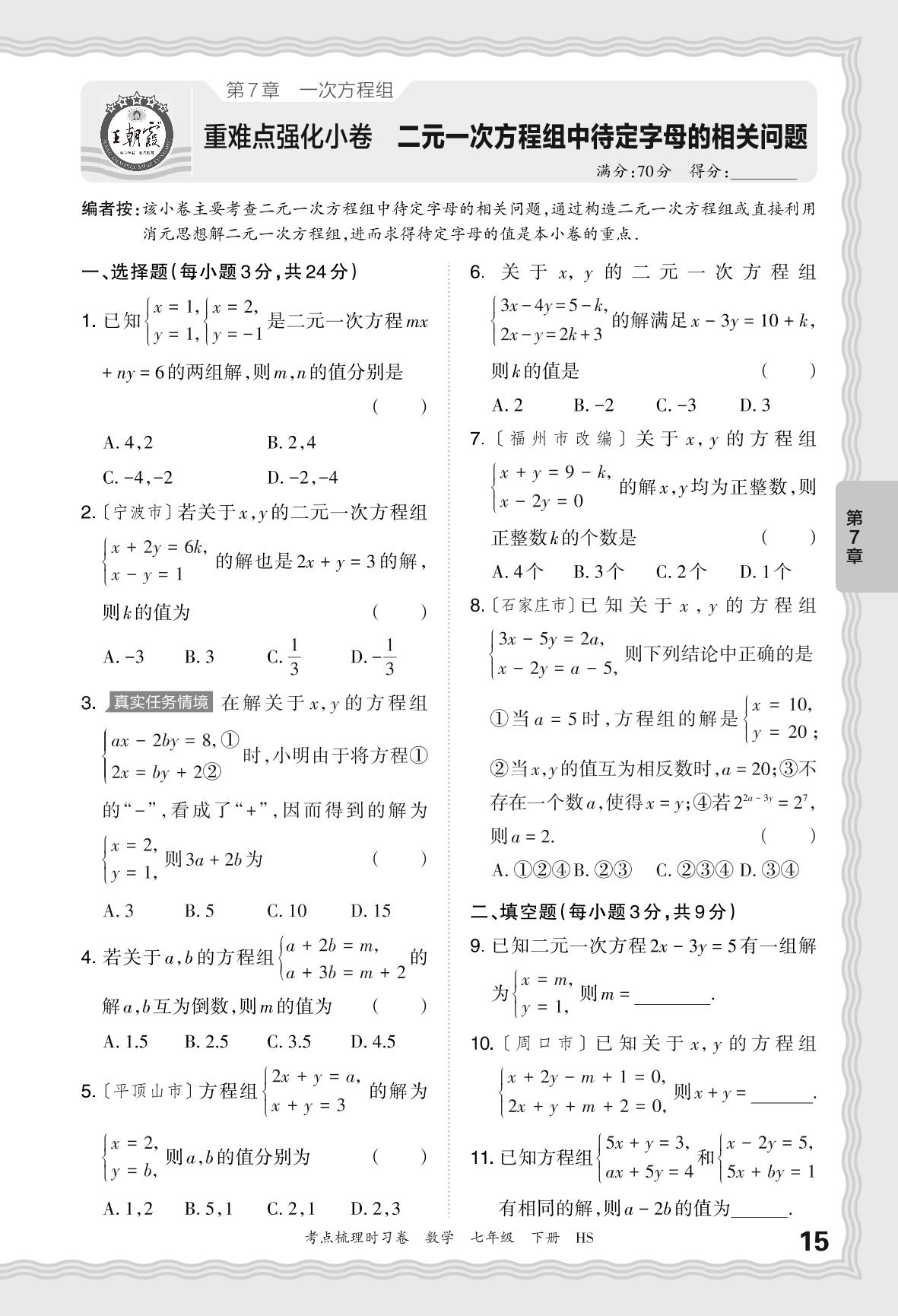 2024春下册七年级数学华师版 第7章 重难点强化小卷 二元一次方程组中待定字母的相关问题