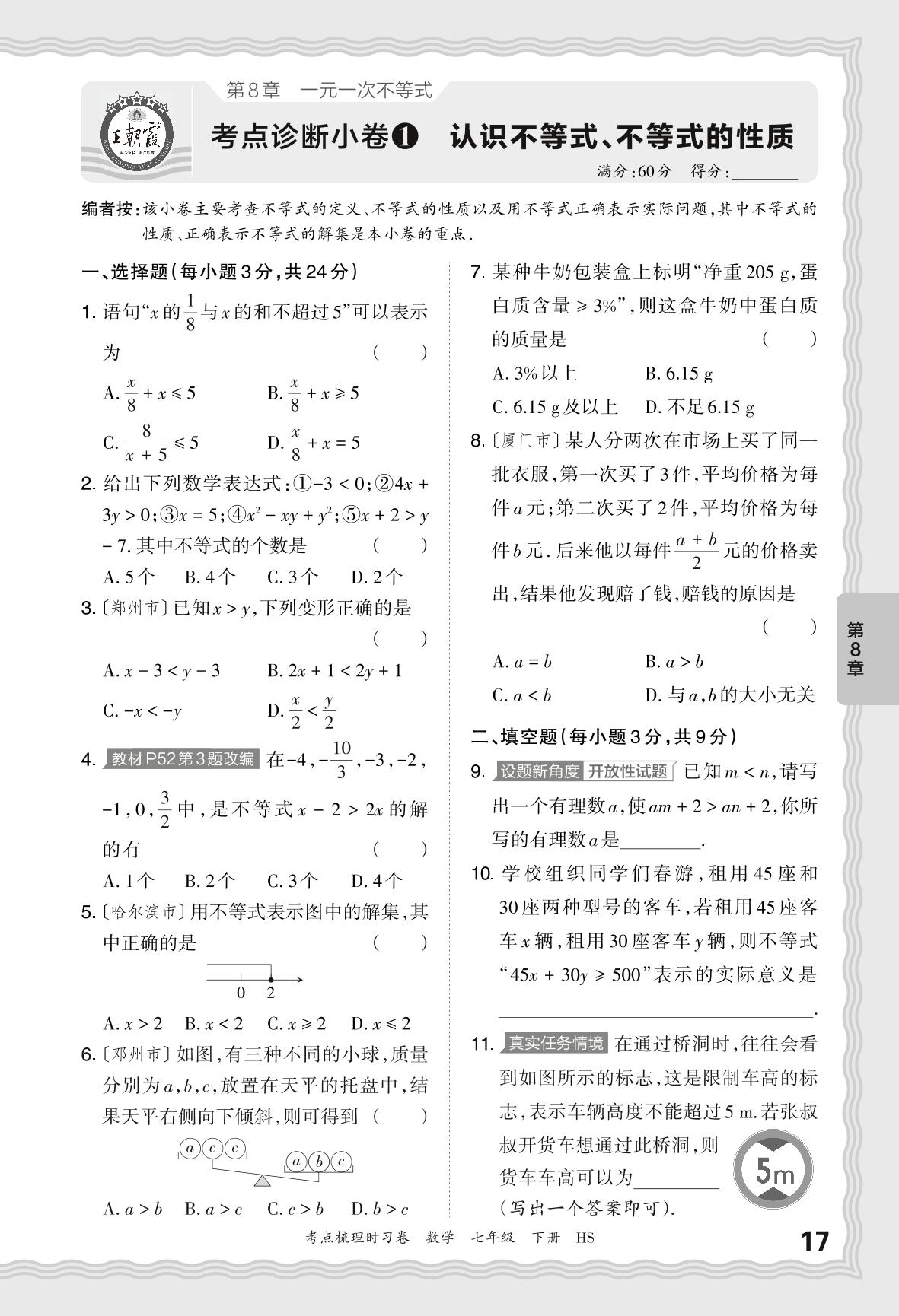 2024春下册七年级数学华师版 第8章 考点诊断小卷 认识不等式、不等式的性质【1】