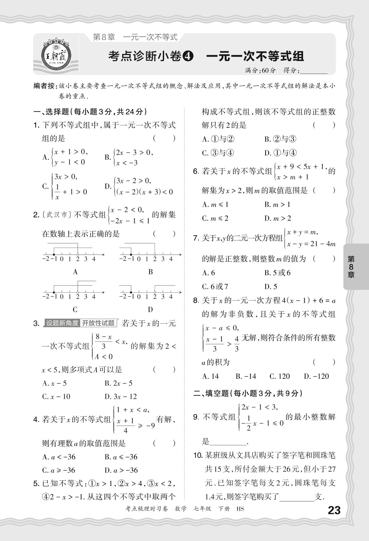 2024春下册七年级数学华师版 第8章 考点诊断小卷 一元一次不等式组【4】