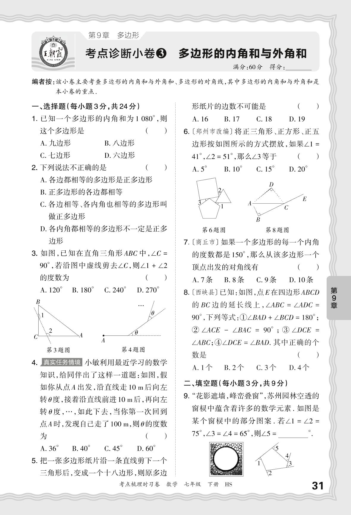 2024春下册七年级数学华师版 第9章 考点诊断小卷 多边形的内角和与外角和【3】