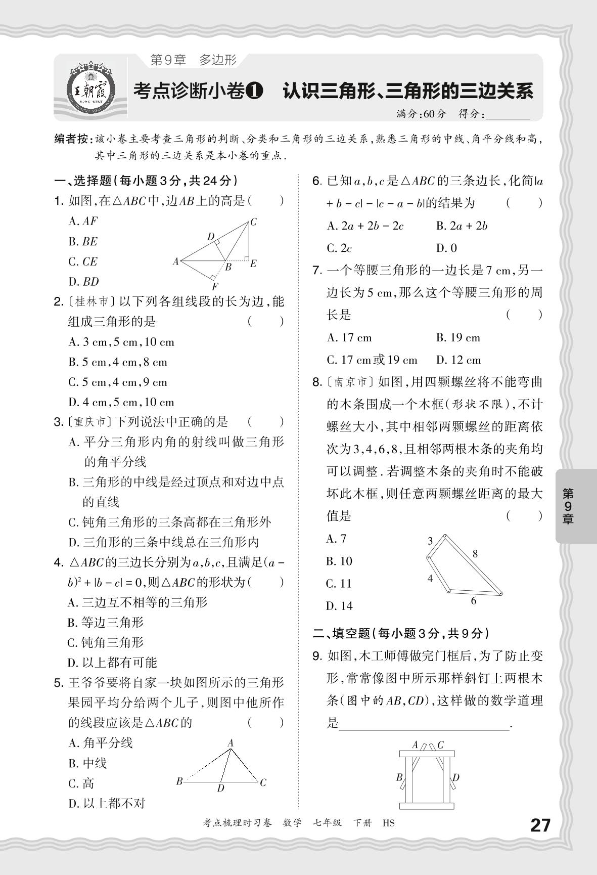2024春下册七年级数学华师版 第9章 考点诊断小卷 认识三角形、三角形的三边关系【1】