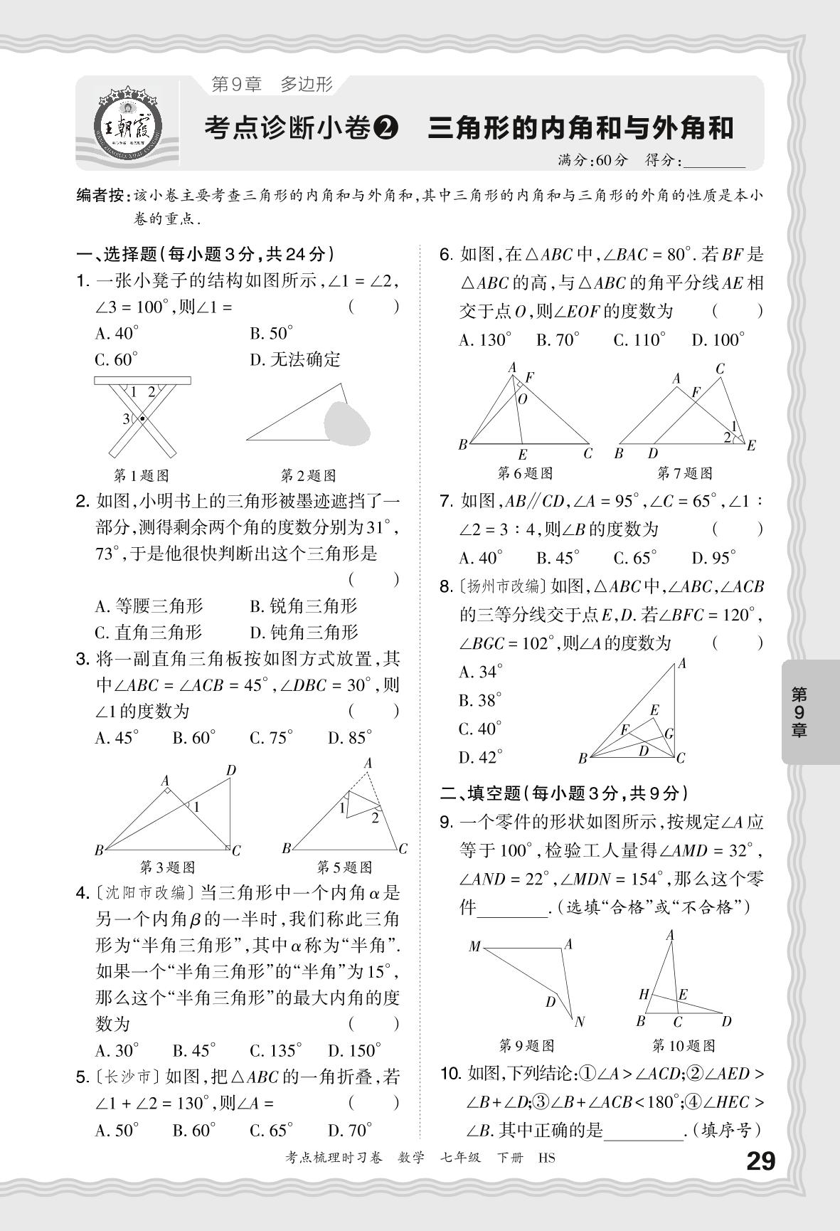 2024春下册七年级数学华师版 第9章 考点诊断小卷 三角形的内角和与外角和【2】