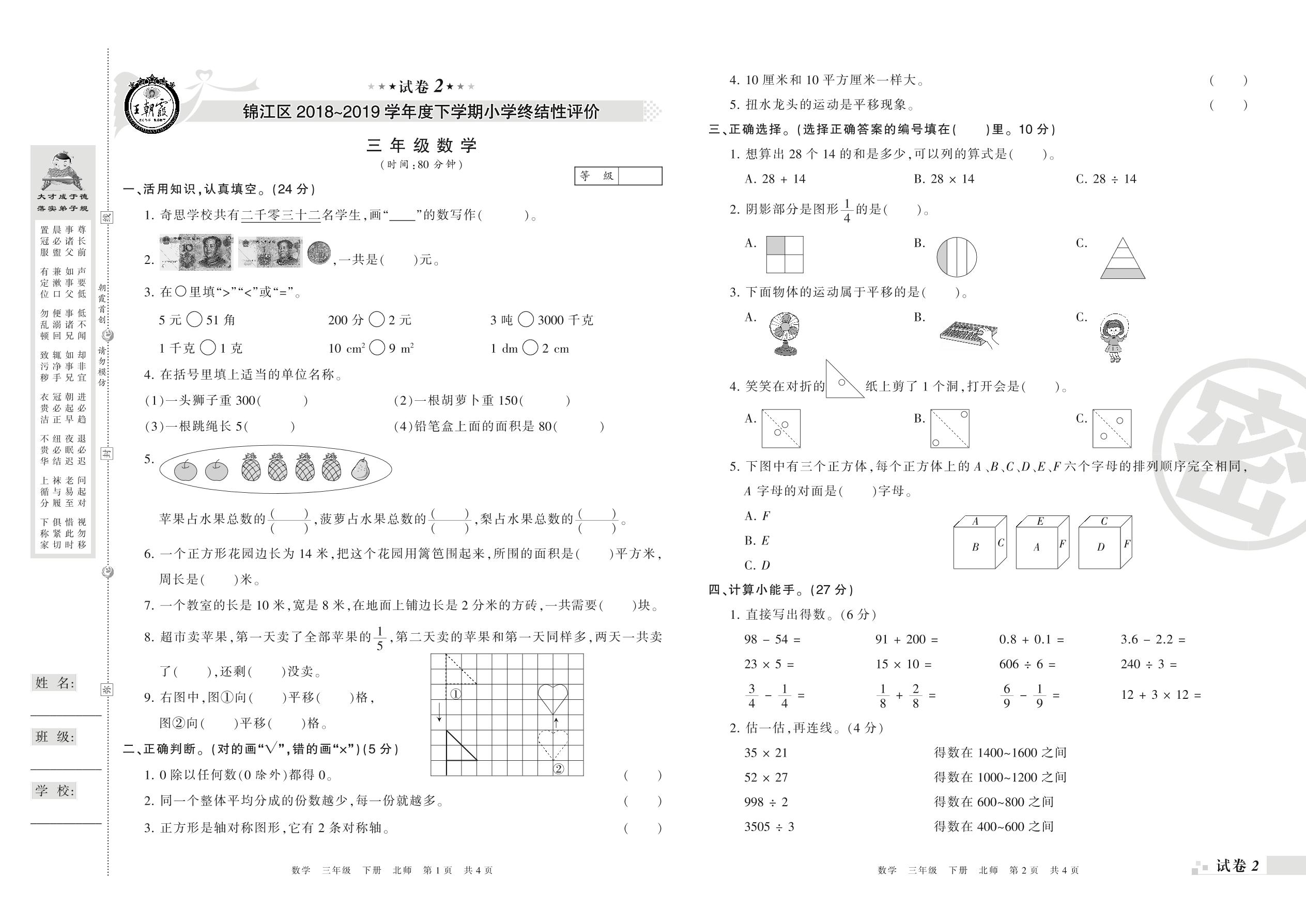 2018-2019学年第二学期成都市锦江区三年级数学试卷(北师版)【2】