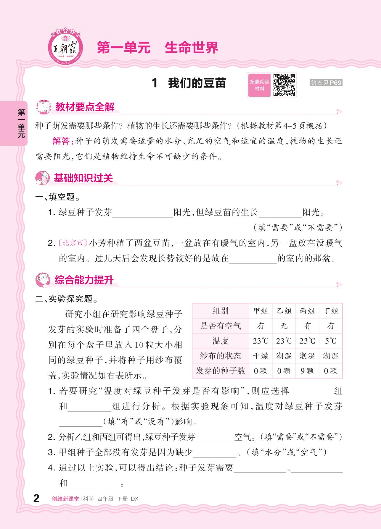 2024春下册四年级科学大象版 第一单元 生命世界——1. 我们的豆苗