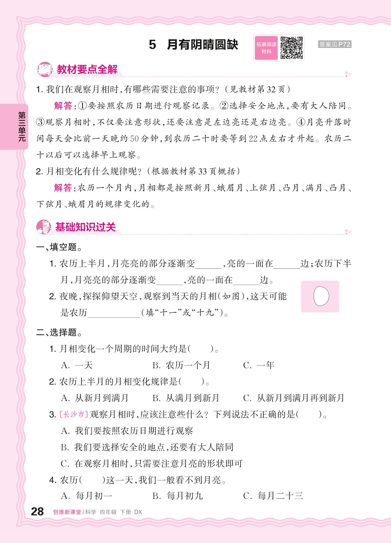 2024春下册四年级科学大象版 第三单元 太阳、地球和月球——5. 月有阴晴圆缺