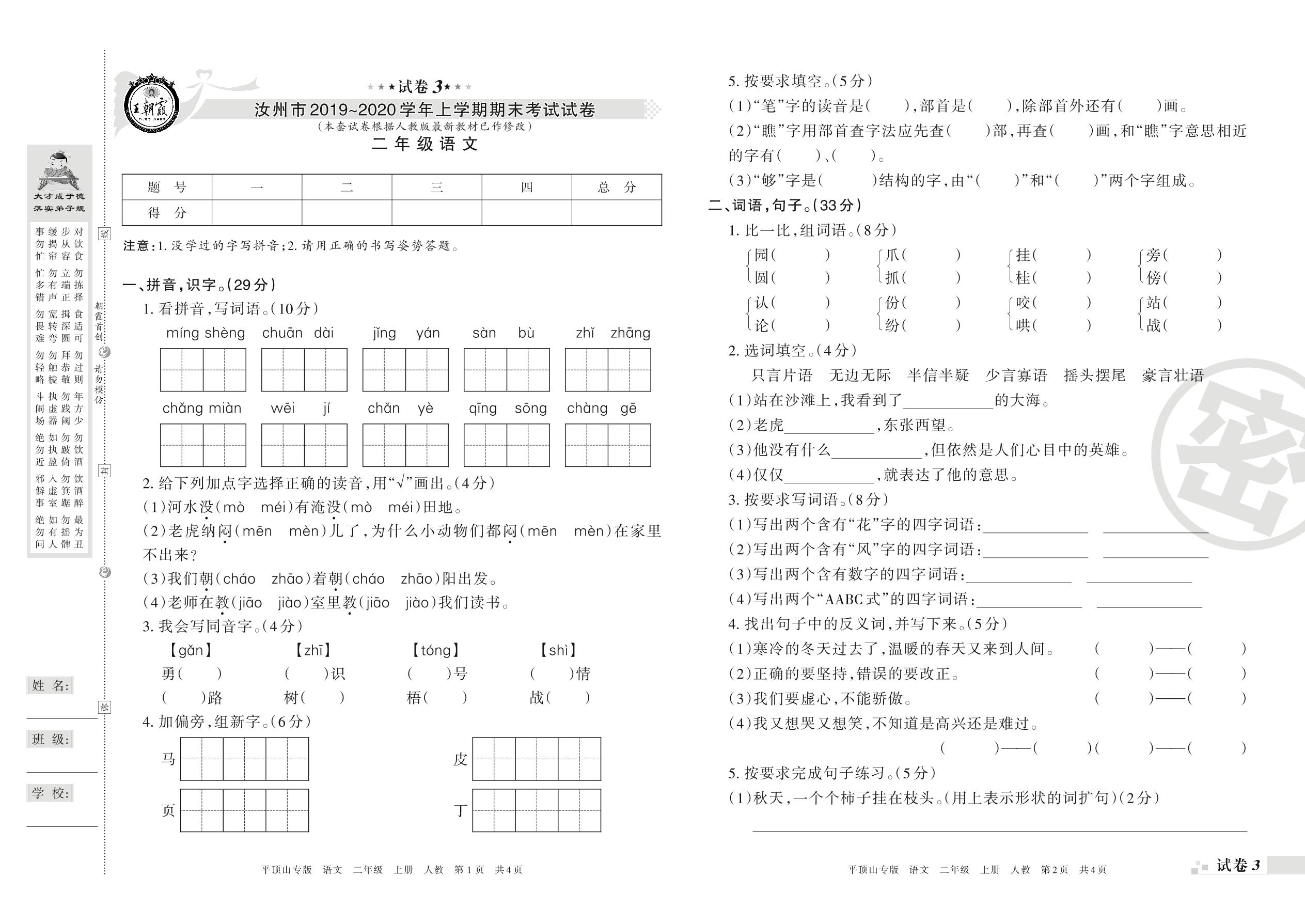 2019-2020学年第一学期汝州市二年级语文试卷(人教版)【3】