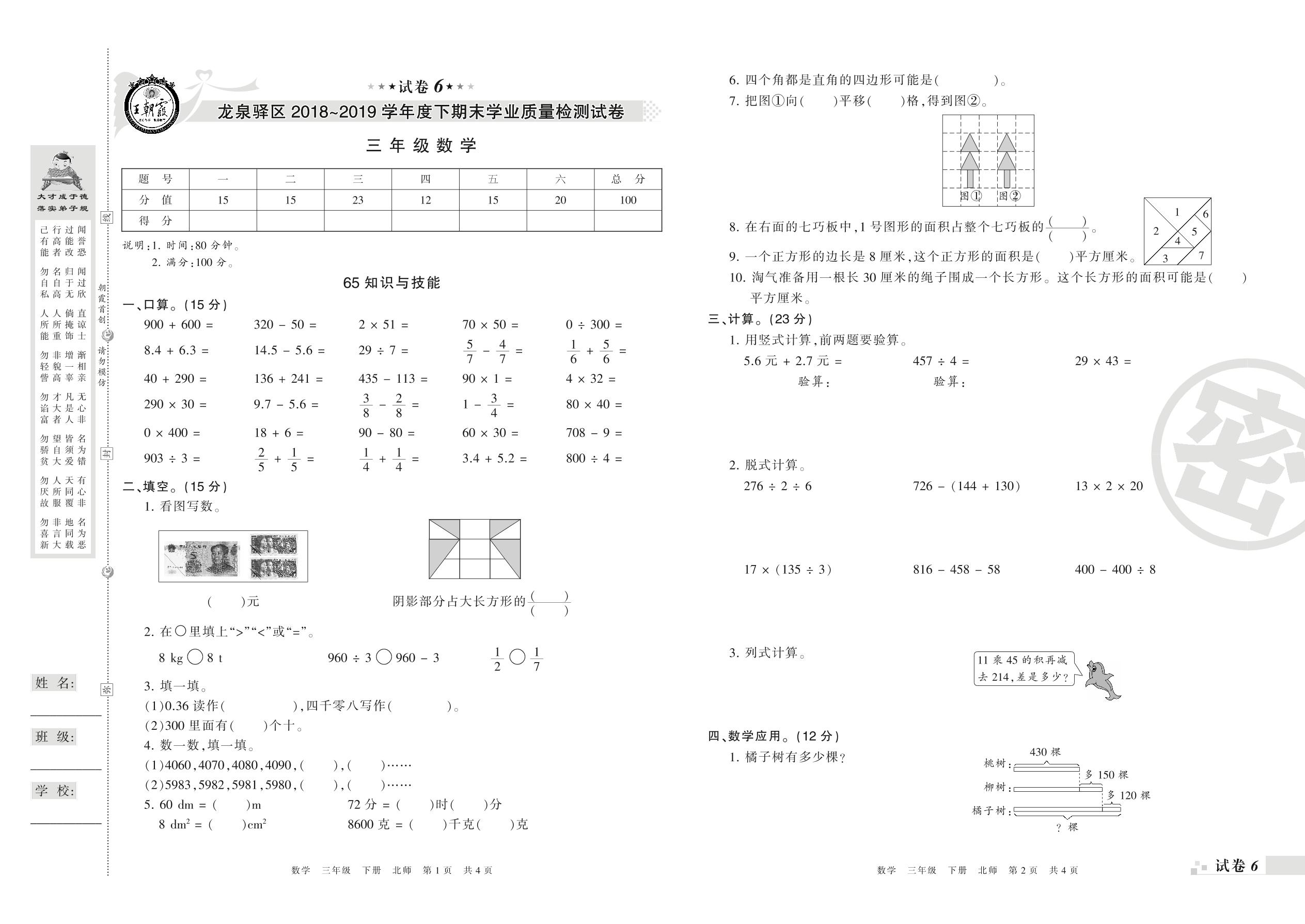 2018-2019学年第二学期成都市龙泉驿区三年级数学试卷(北师版)【6】