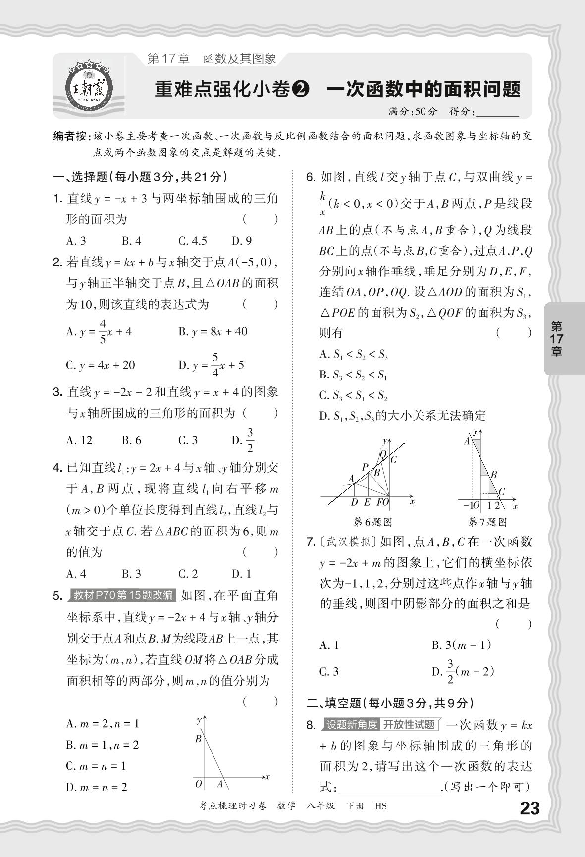 2024春下册八年级数学华师版 第17章 重难点强化小卷 一次函数中的面积问题【2】