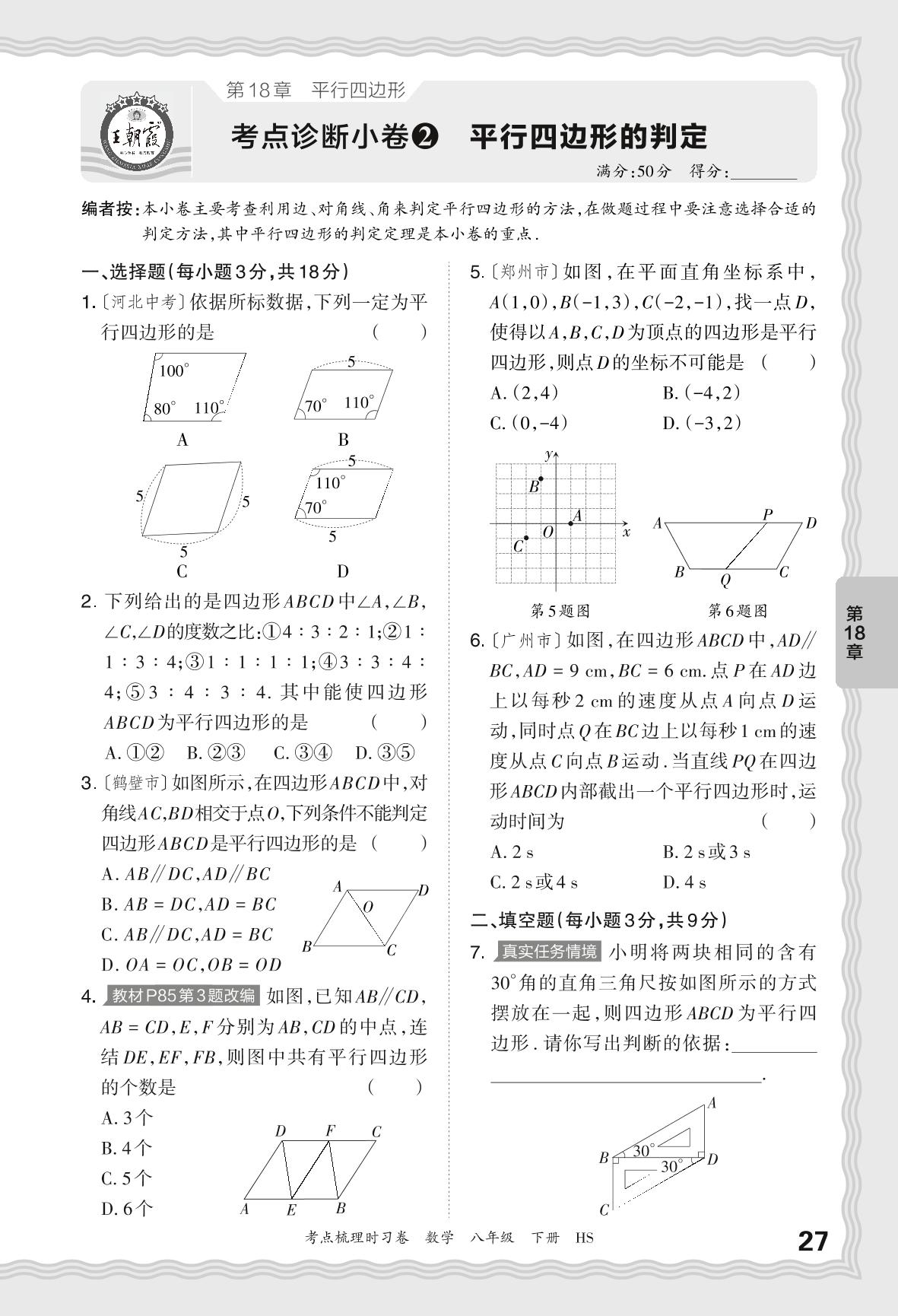 2024春下册八年级数学华师版 第18章 考点诊断小卷 平行四边形的判定【2】