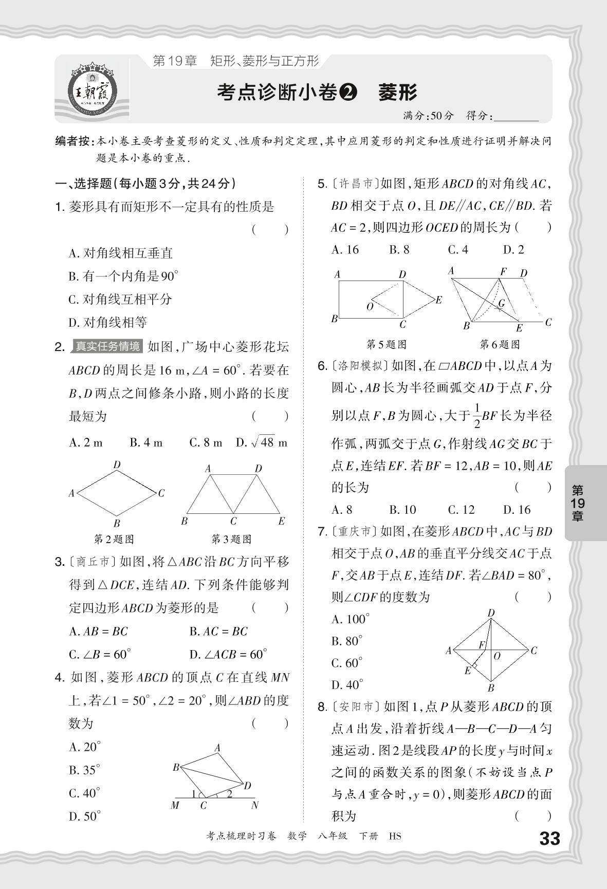 2024春下册八年级数学华师版 第19章 考点诊断小卷 菱形【2】