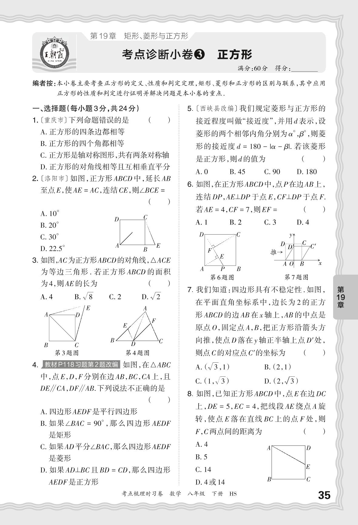 2024春下册八年级数学华师版 第19章 考点诊断小卷 正方形【3】