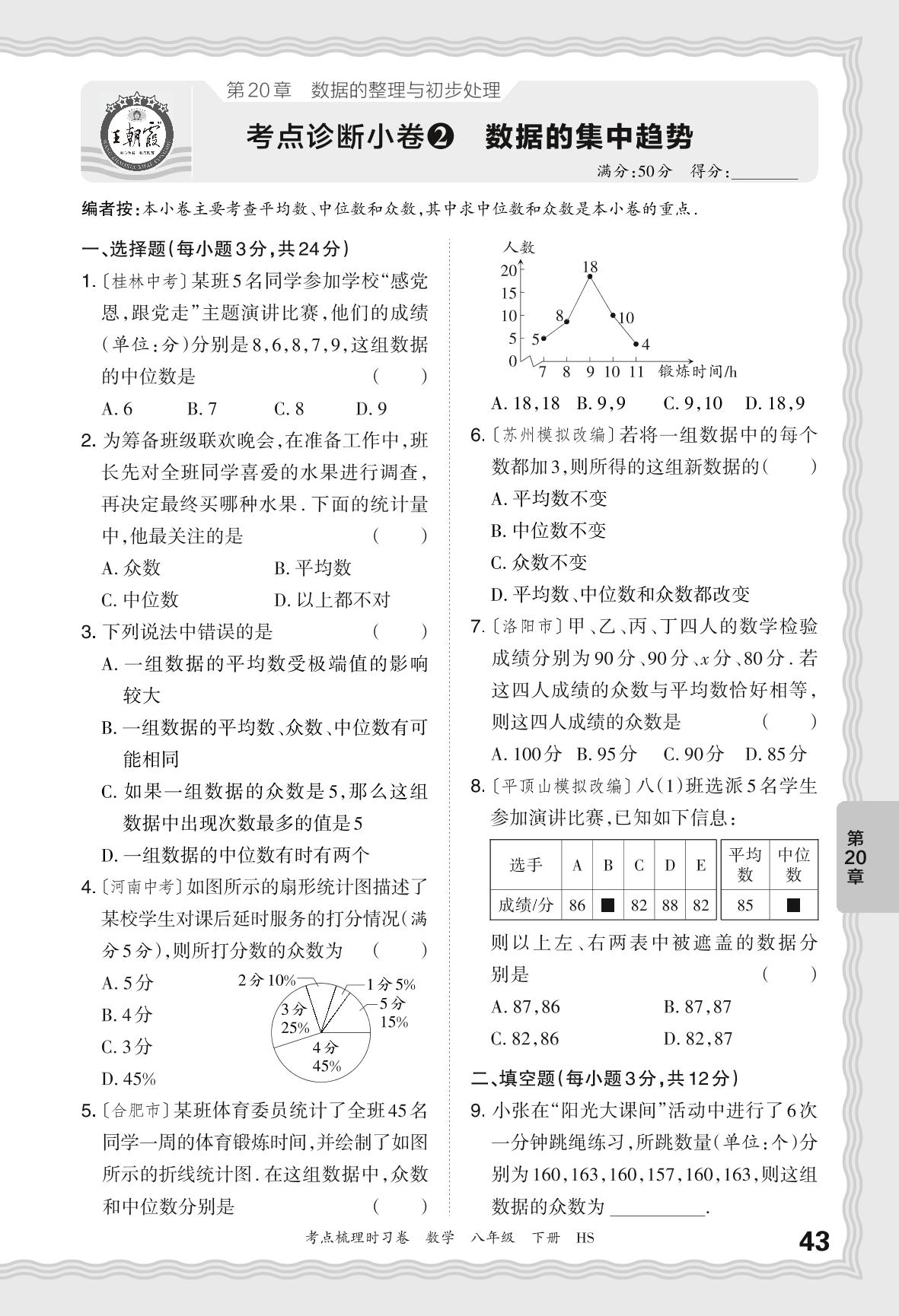 2024春下册八年级数学华师版 第20章 考点诊断小卷 数据的集中趋势【2】