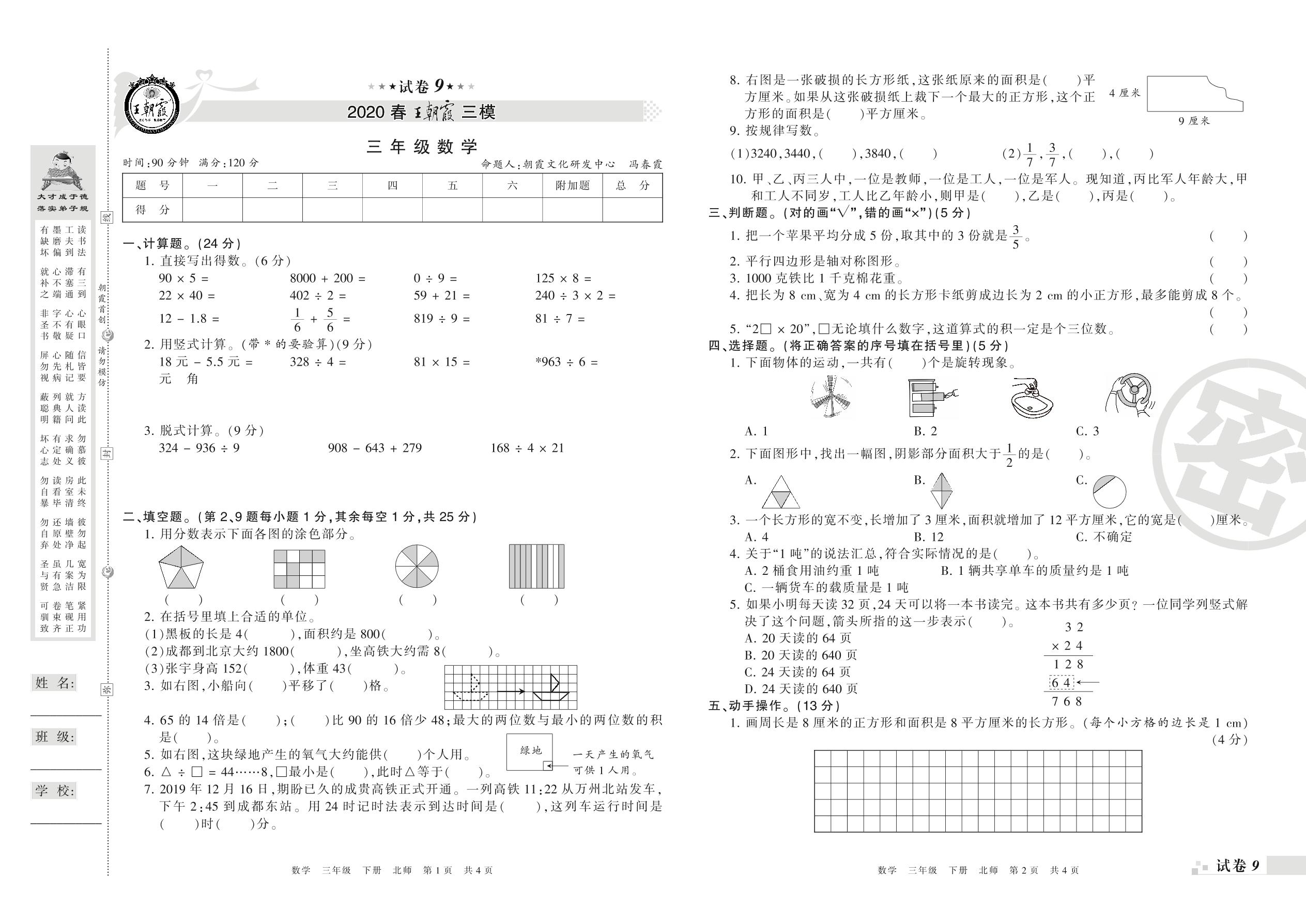 王朝霞期末模拟卷三年级下册数学(北师版)_R21080493216【9】