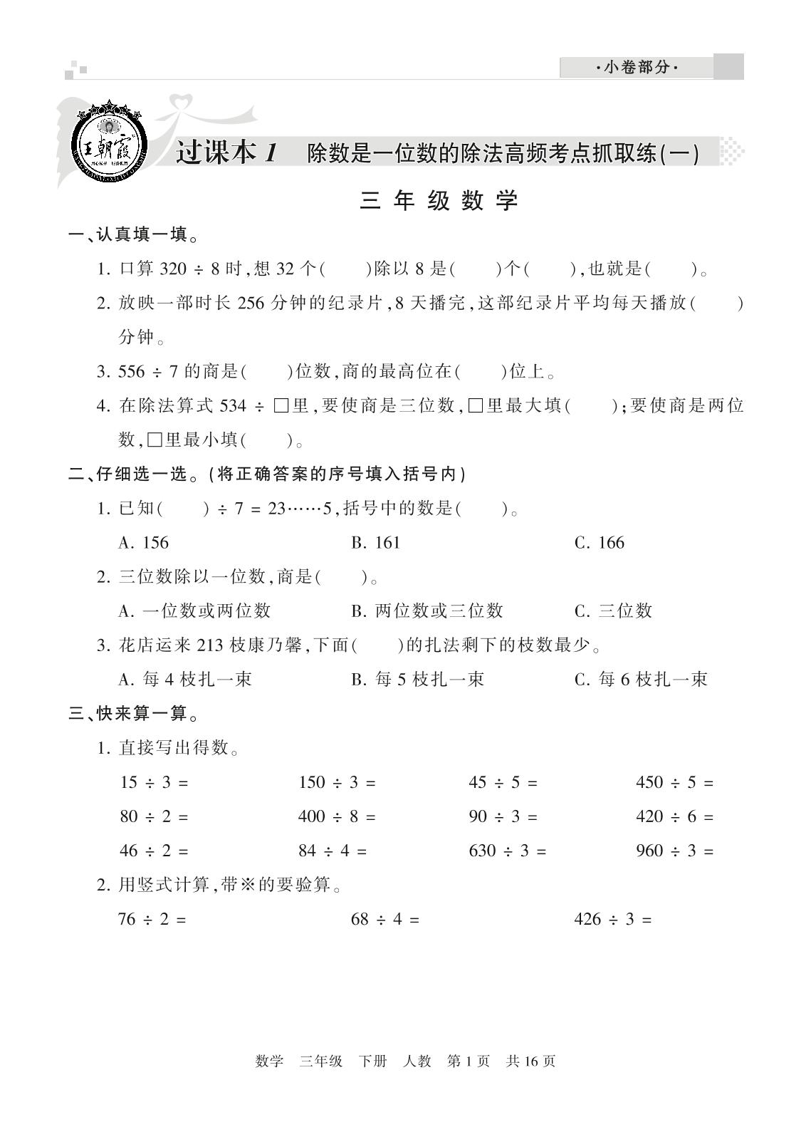 三年级数学人教版下册过课本