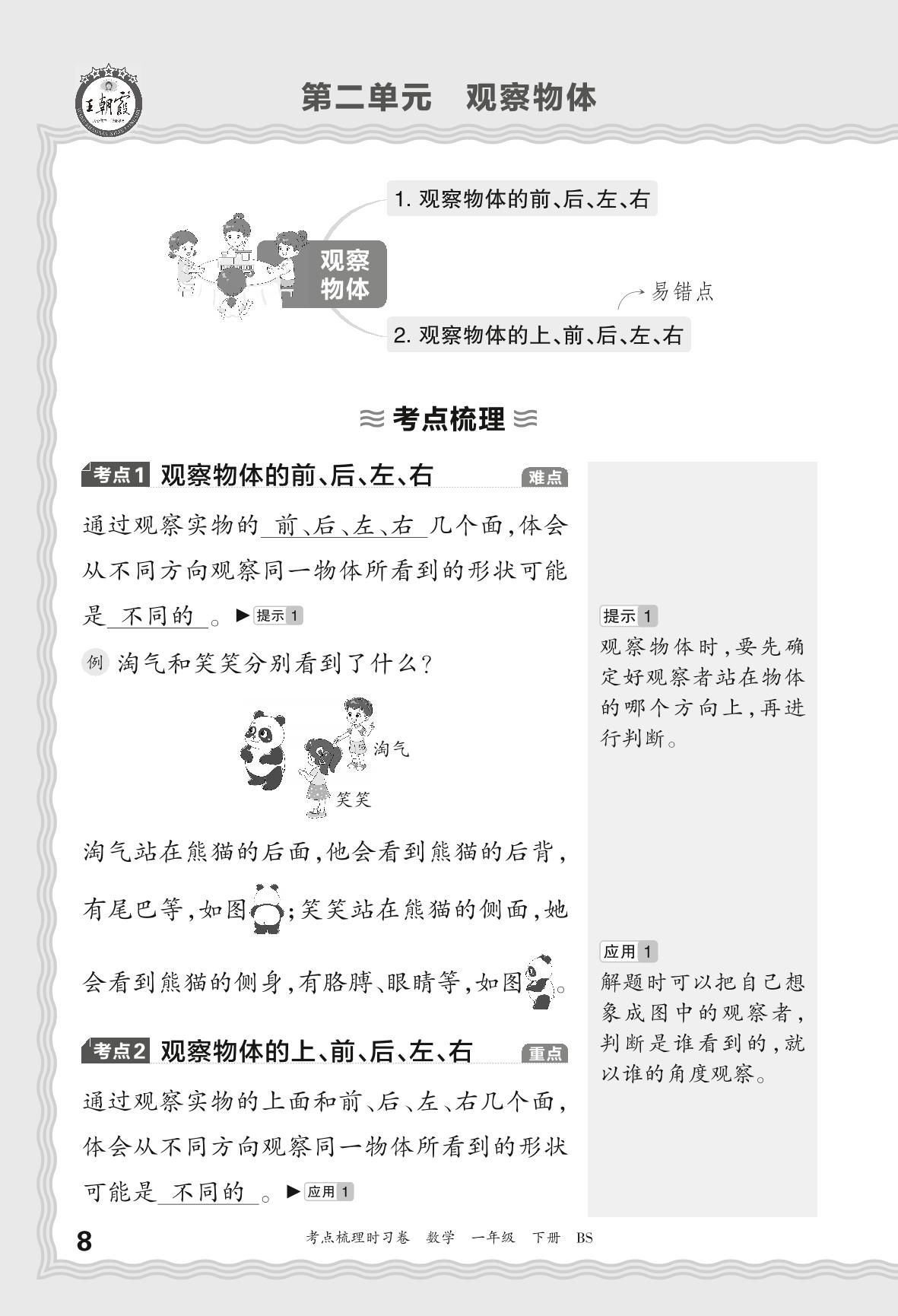 2024春下册一年级数学北师版 考点梳理手册——第二单元 观察物体