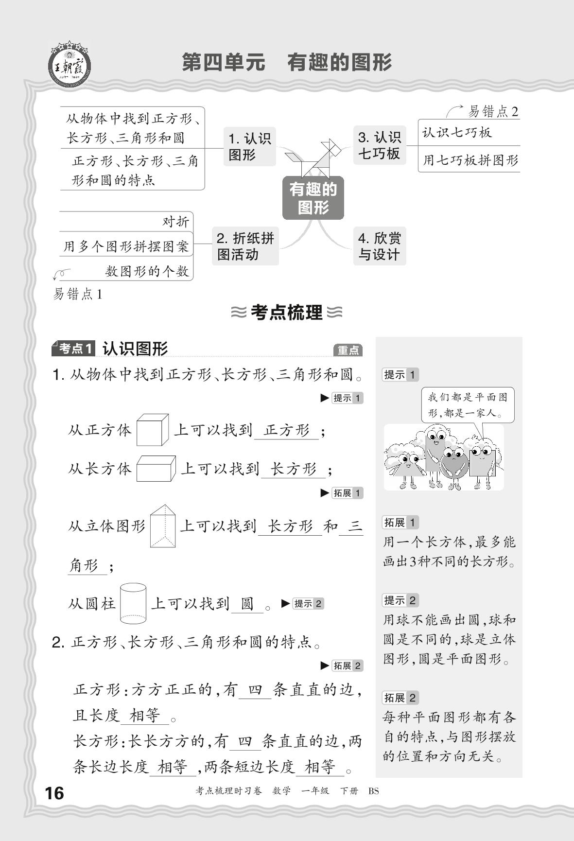 2024春下册一年级数学北师版 考点梳理手册——第四单元 有趣的图形