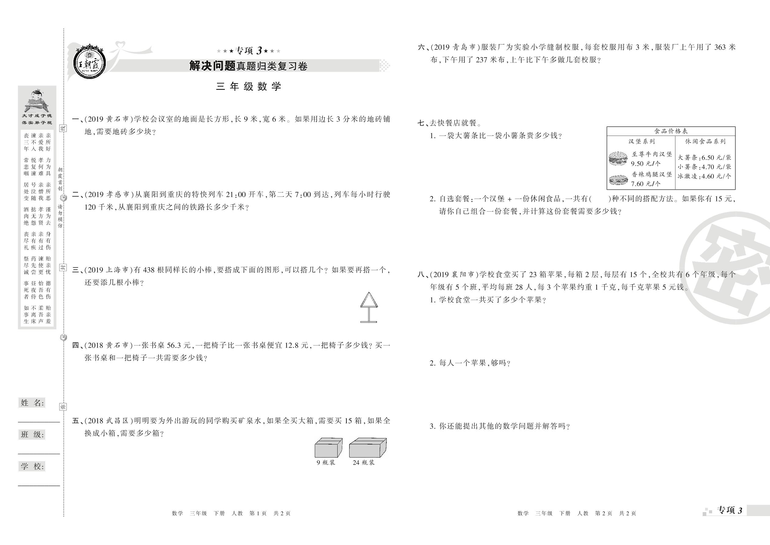 王朝霞期末专项卷——解决问题真题归类复习卷、新颖题速递:生活与数学三年级下册数学(人教版)_R21080493229【0】