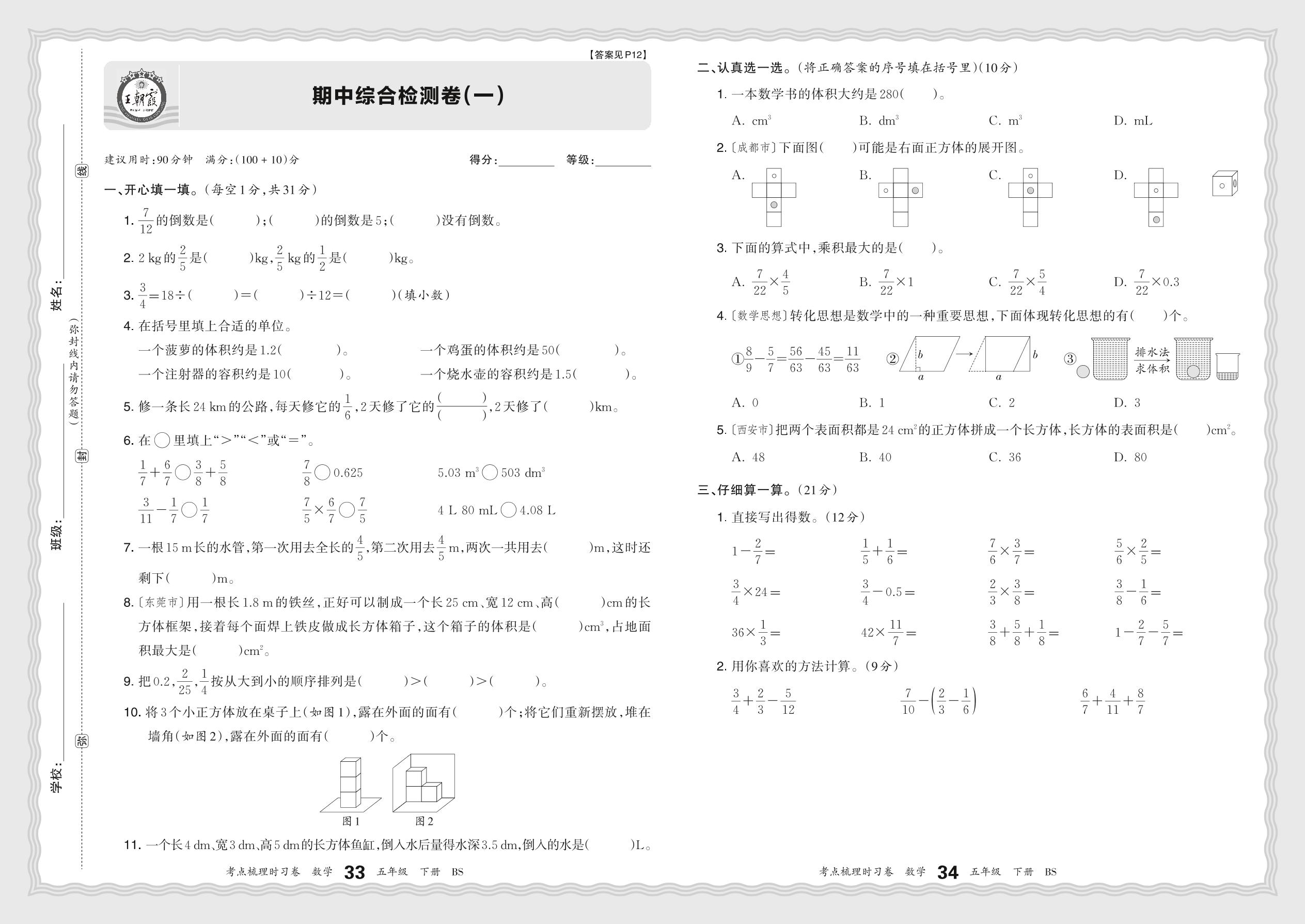 2024春下册五年级数学北师版 期中综合检测试卷(一)