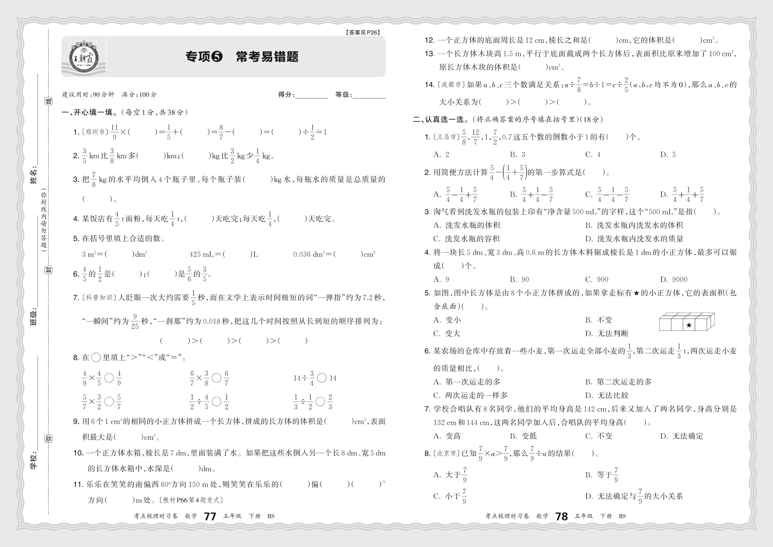 2024春下册五年级数学北师版 期末专项卷KD版·常考易错题【5】