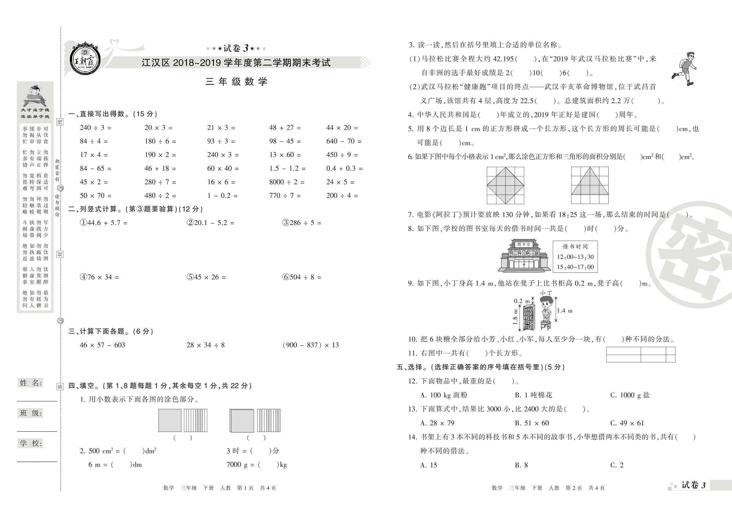 2018-2019学年第二学期武汉市江汉区三年级数学试卷(人教版)【3】