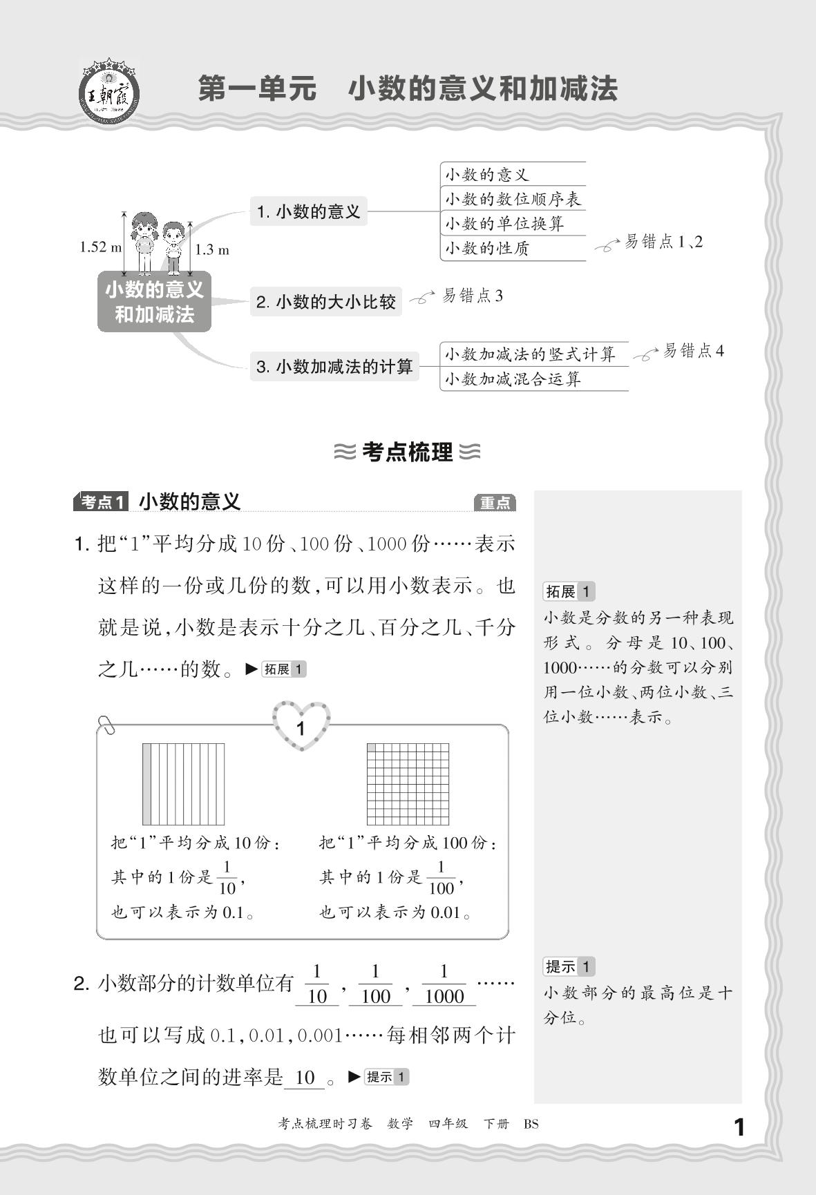 2024春下册四年级数学北师版 考点梳理手册——第一单元 小数的意义和加减法