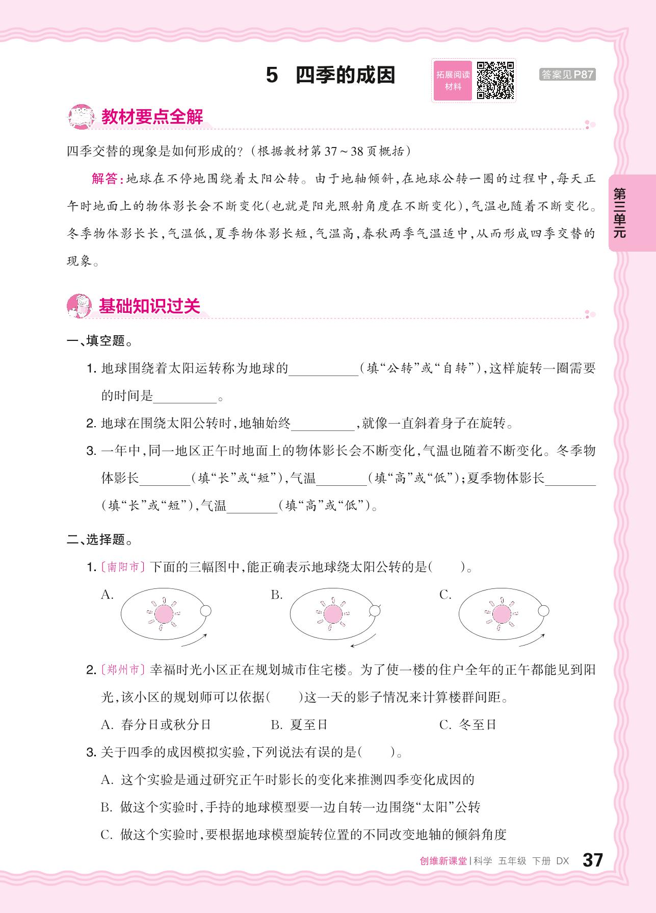 2024春下册五年级科学大象版 第三单元 转动的地球——5. 四季的成因
