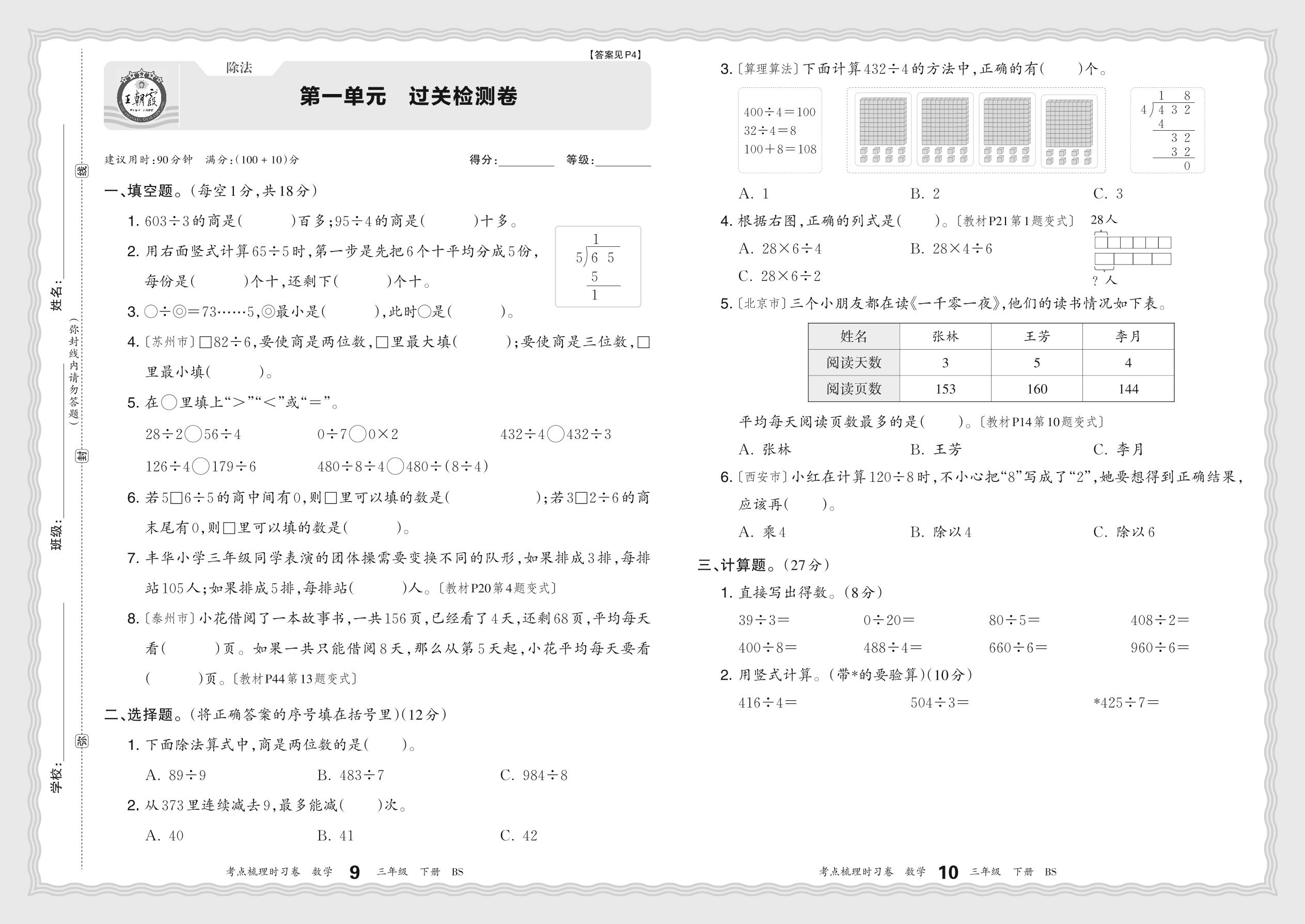 2024春下册三年级数学北师版 第一单元 过关检测卷