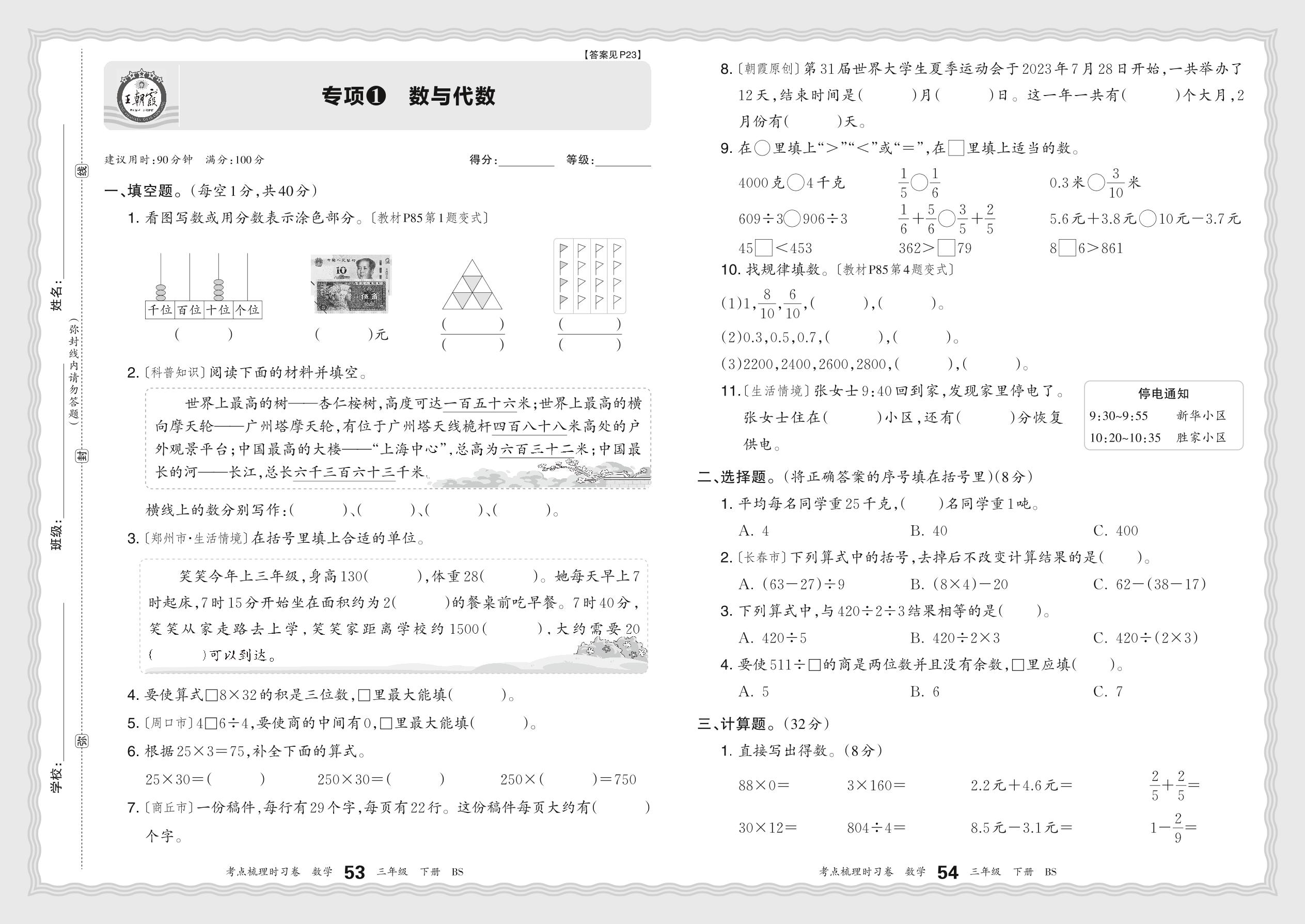2024春下册三年级数学北师版 期末专项卷KD版·数与代数【1】