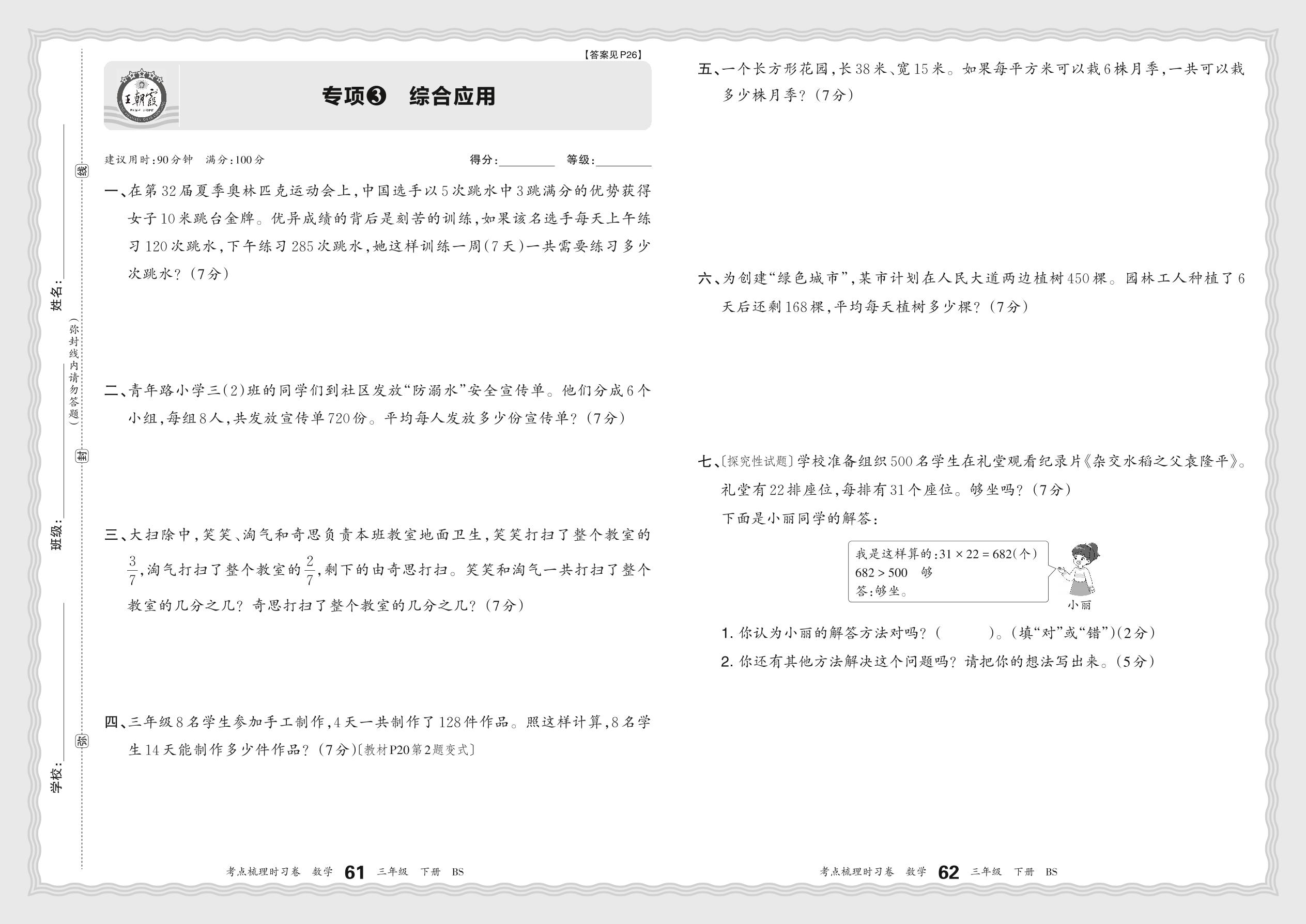 2024春下册三年级数学北师版 期末专项卷KD版·综合应用【3】