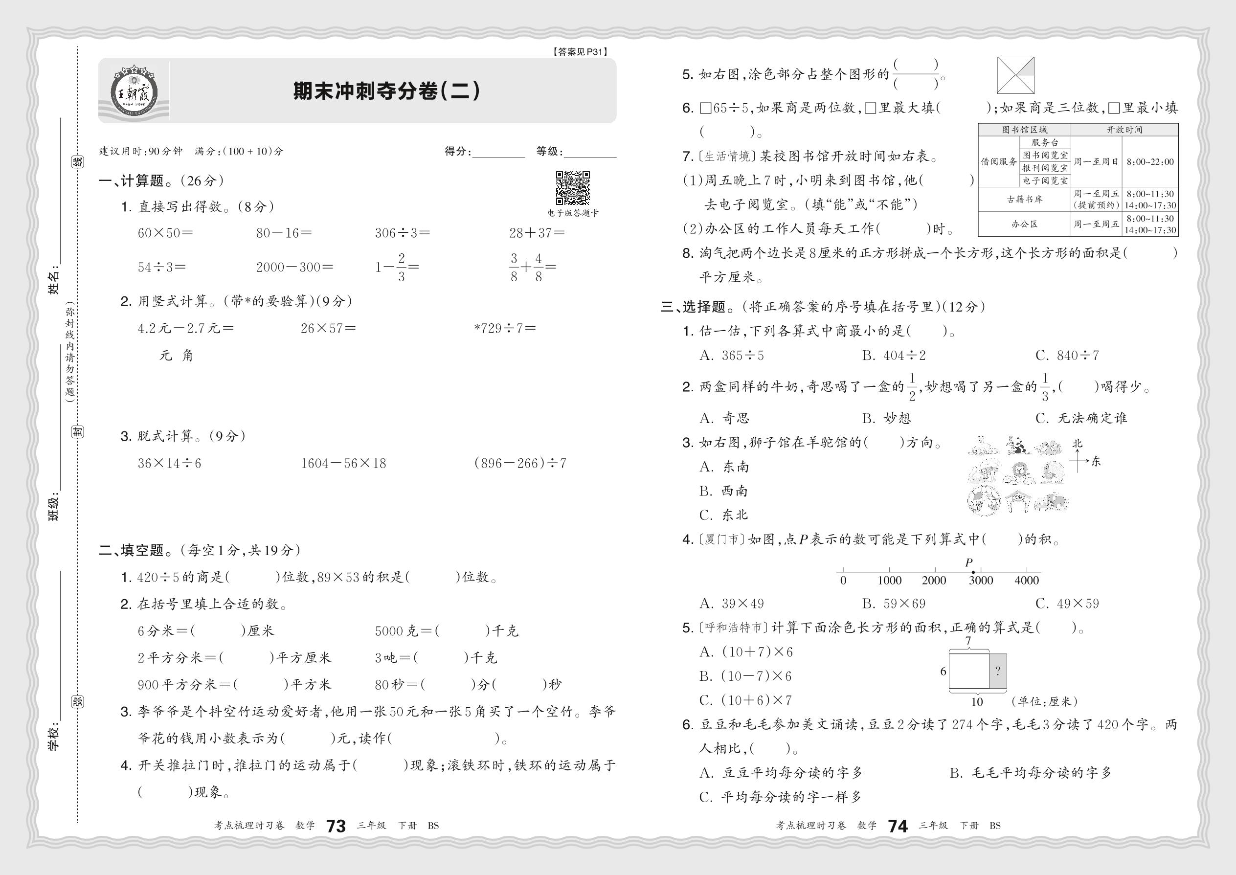 2024春下册三年级数学北师版 期末冲刺夺分卷(二)