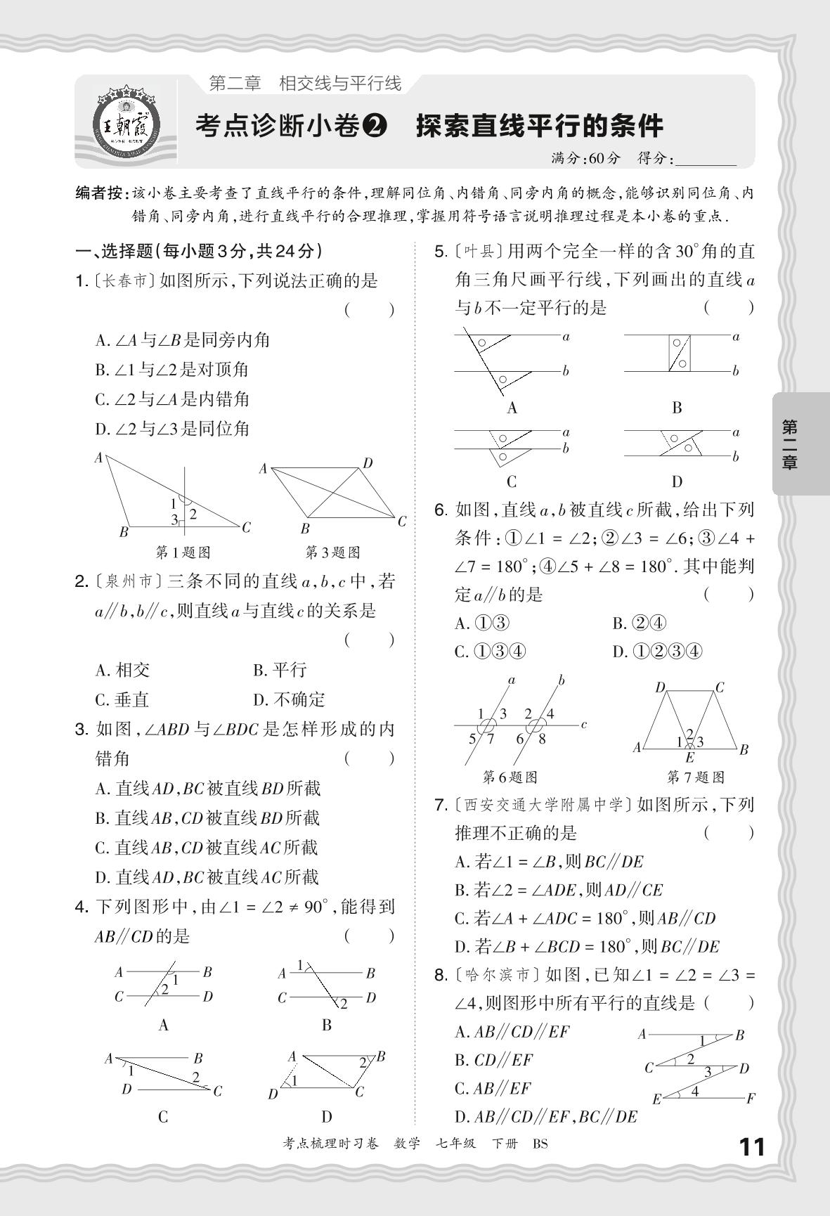 2024春下册七年级数学北师版 第二章 考点诊断小卷 探索直线平行的条件【2】