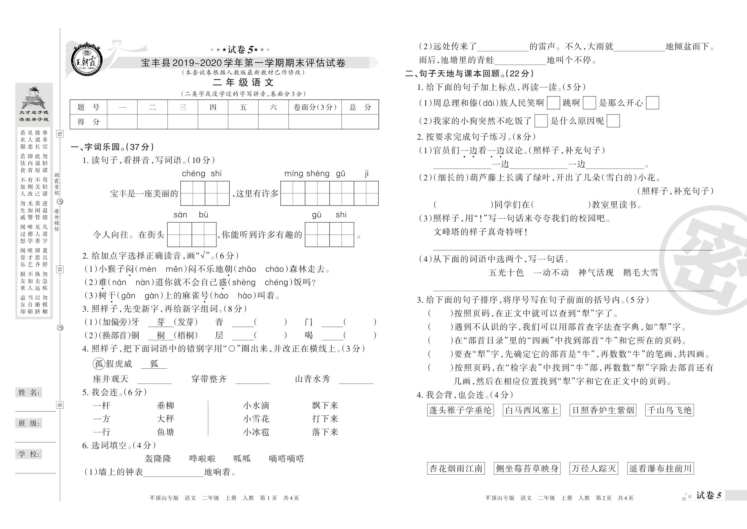 2019-2020学年第一学期平顶山市宝丰县二年级语文试卷(人教版)【5】