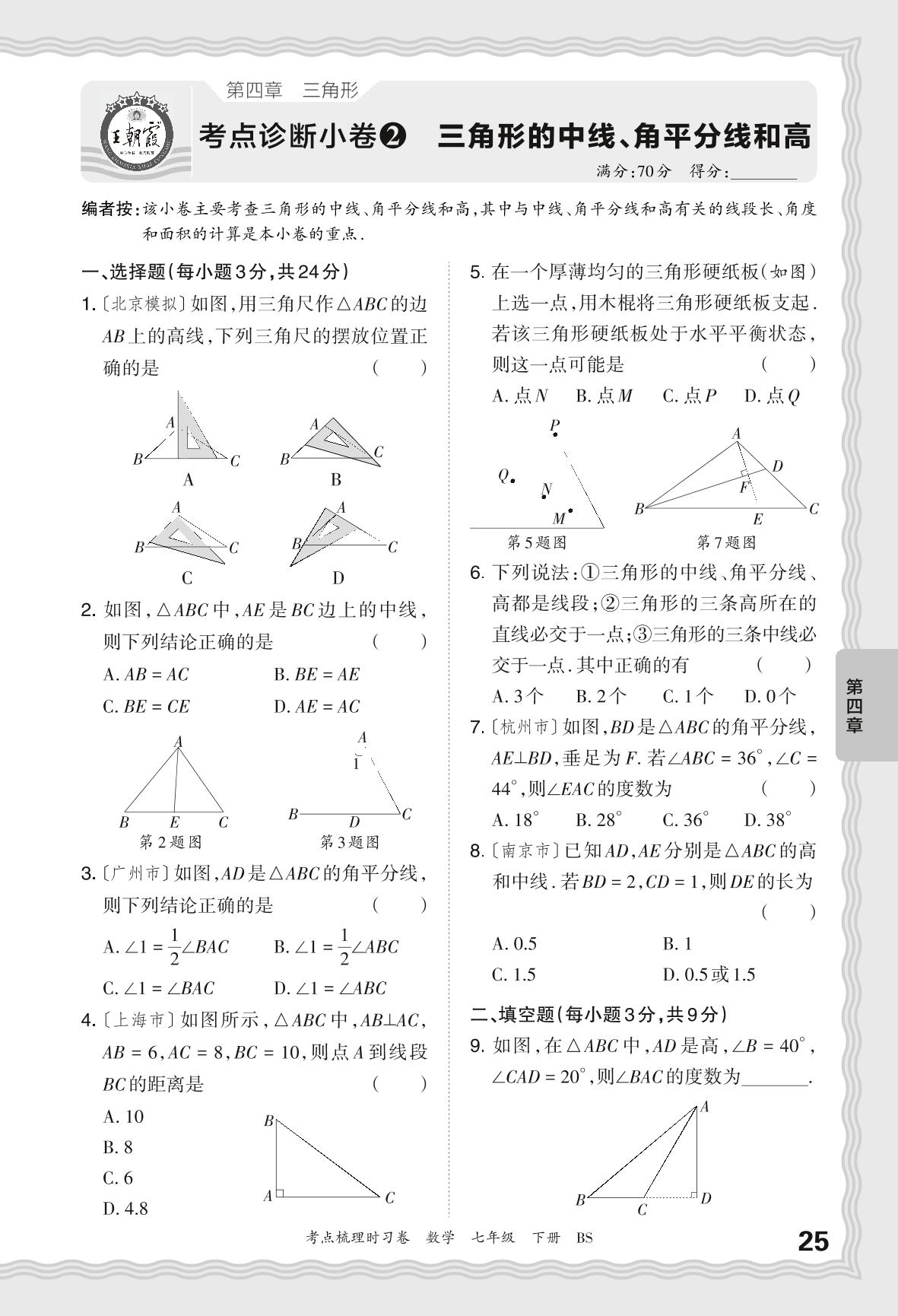 2024春下册七年级数学北师版 第四章 考点诊断小卷 三角形的中线、角平分线和高【2】