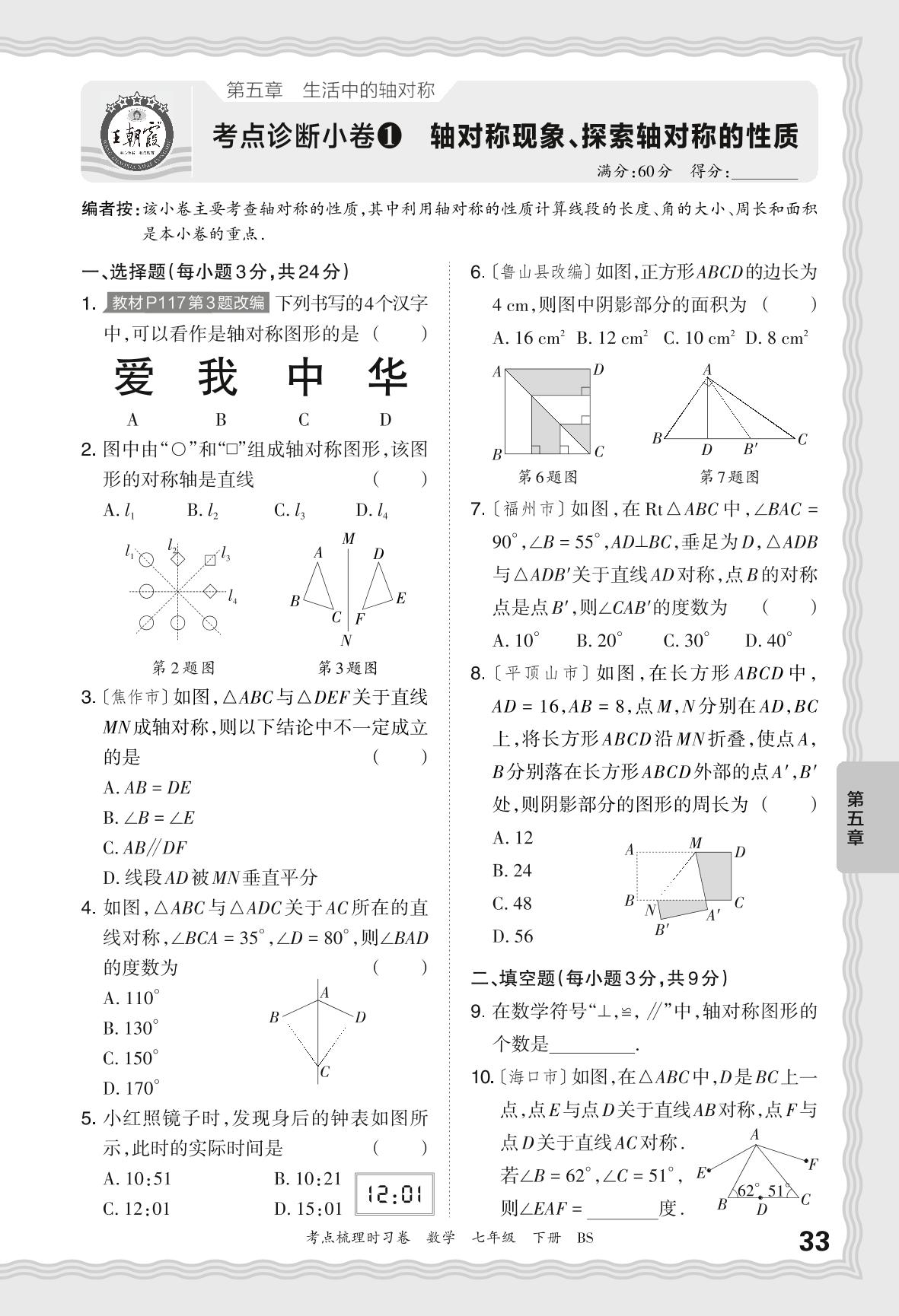 2024春下册七年级数学北师版 第五章 考点诊断小卷 轴对称现象、探索轴对称的性质【1】