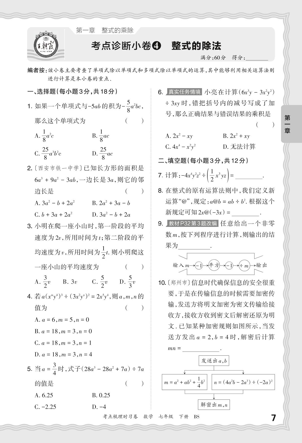 2024春下册七年级数学北师版 第一章 考点诊断小卷 整式的除法【4】