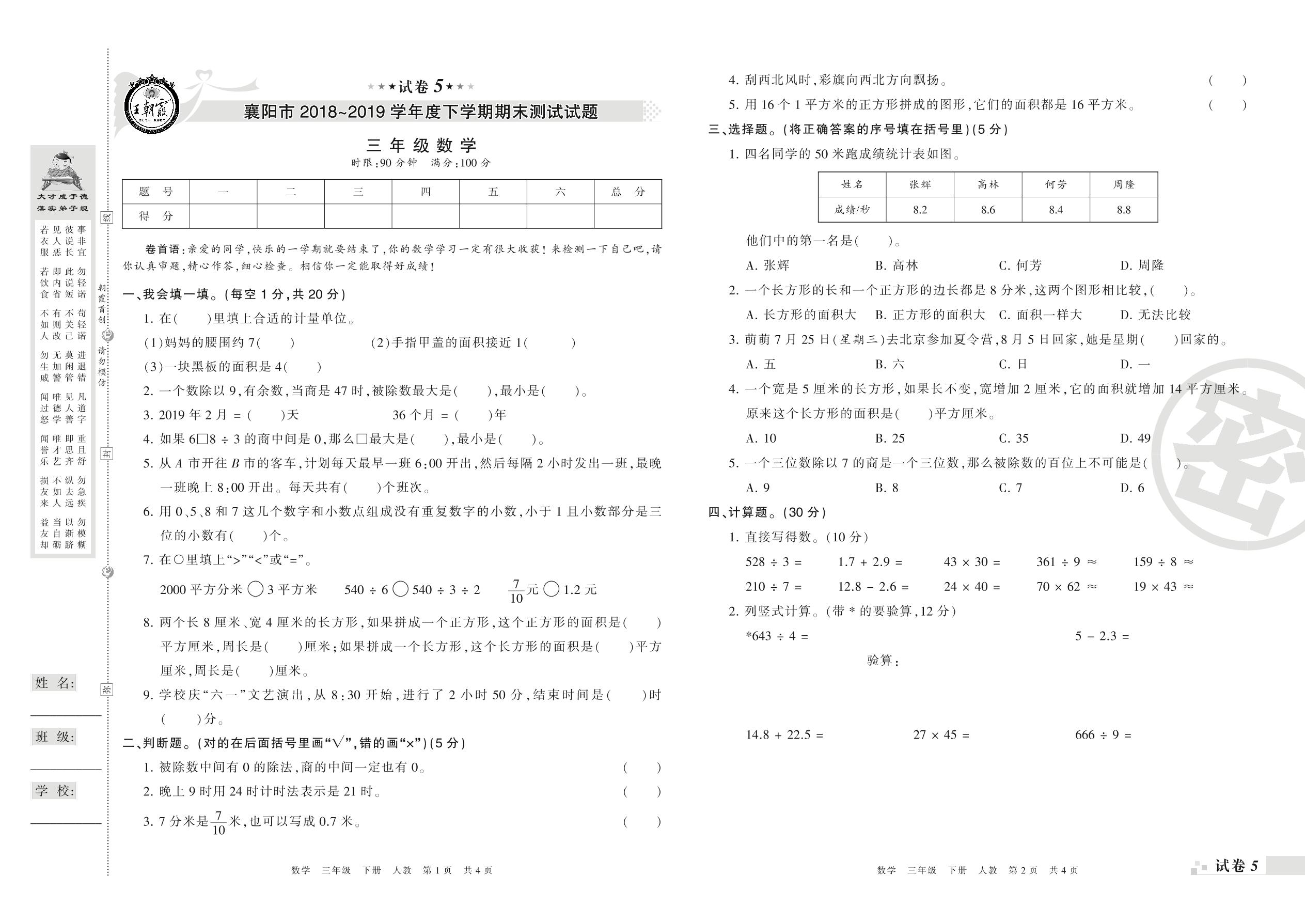 2018-2019学年第二学期襄阳市三年级数学试卷(人教版)【5】