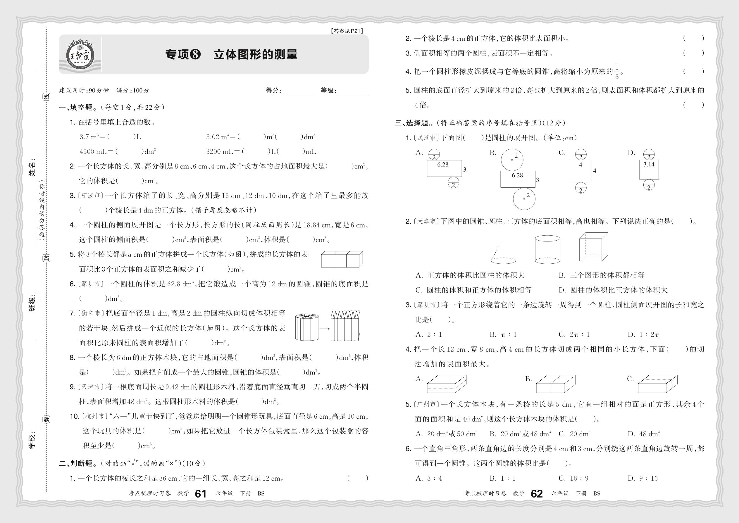 2024春下册六年级数学北师版 期末专项卷KD版·立体图形的测量【8】