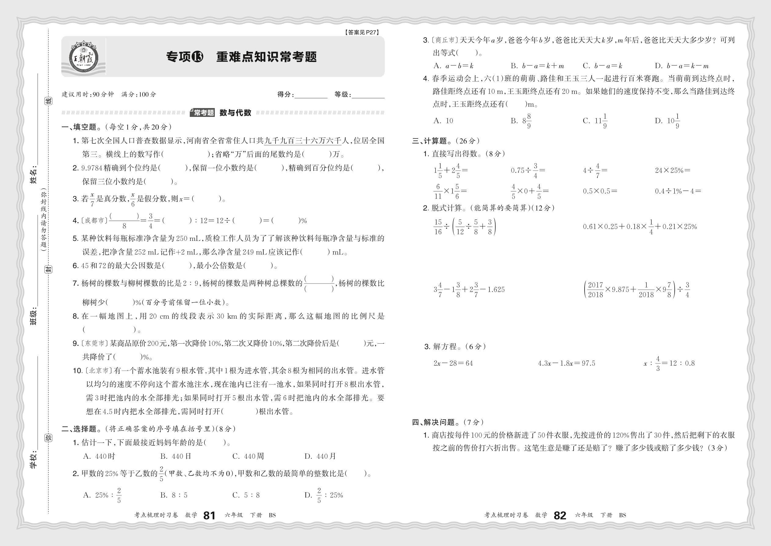 2024春下册六年级数学北师版 期末专项卷KD版·重难点知识常考题【13】