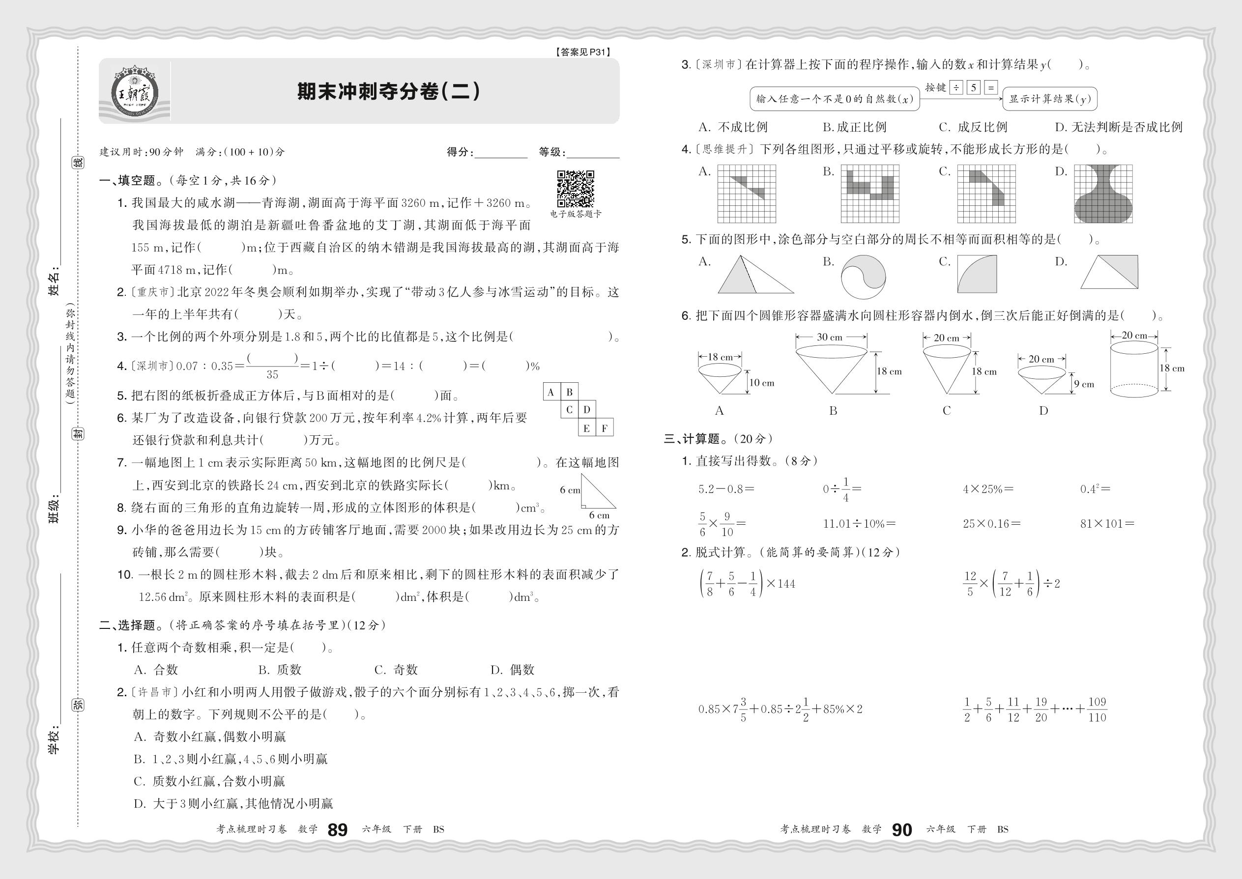 2024春下册六年级数学北师版 期末冲刺夺分卷(二)