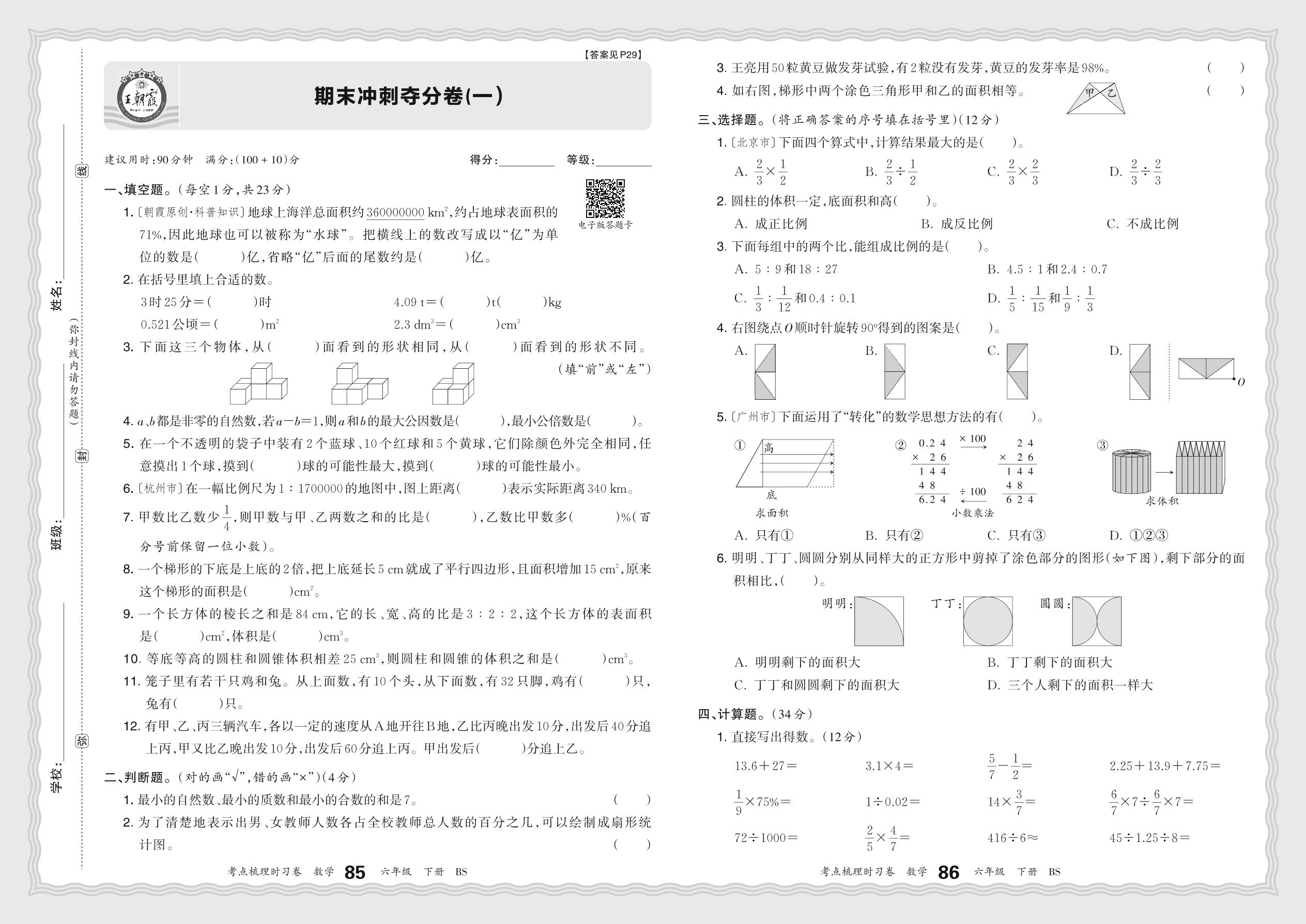 2024春下册六年级数学北师版 期末冲刺夺分卷(一)