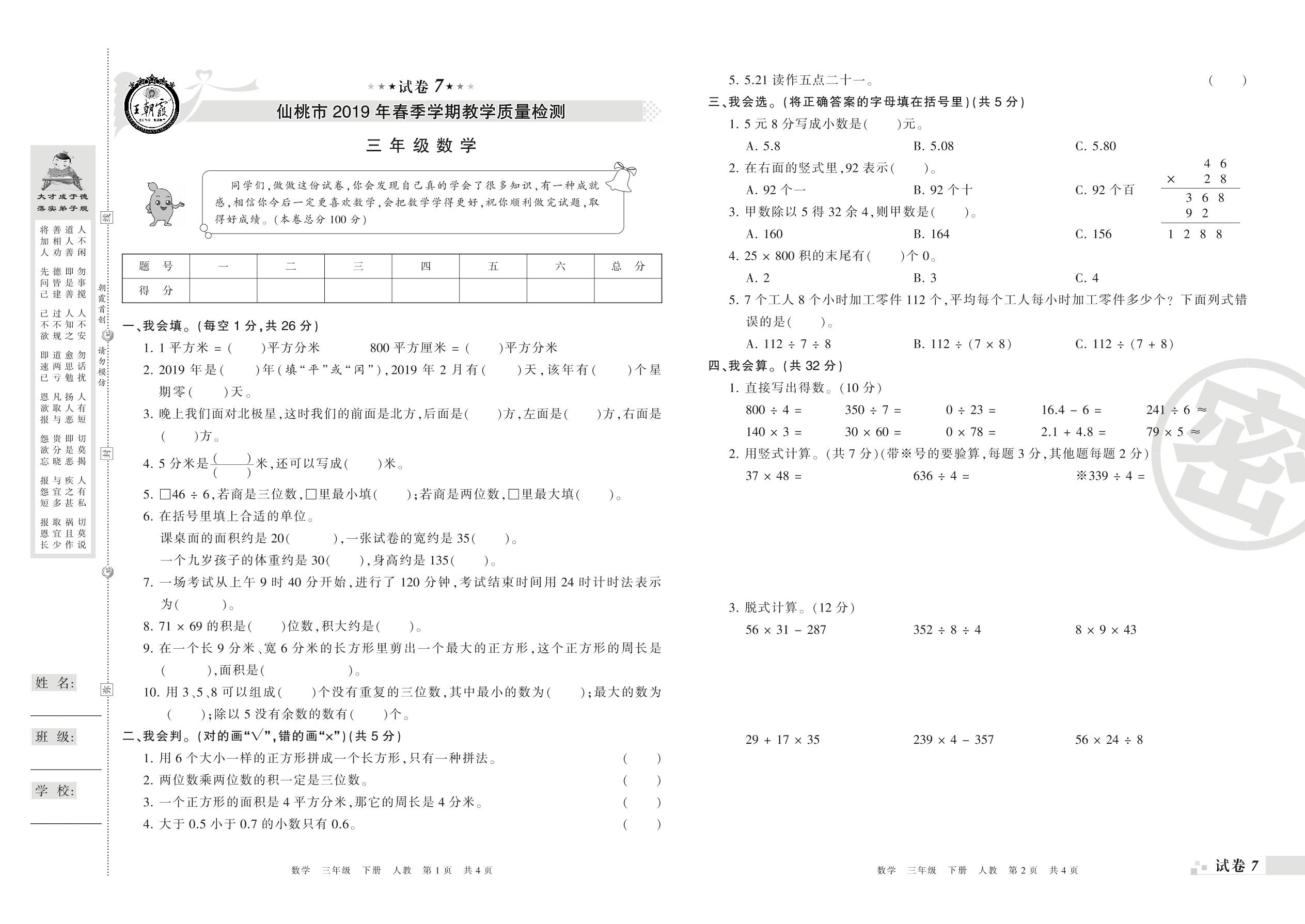 2018-2019学年第二学期仙桃市三年级数学试卷(人教版)【7】