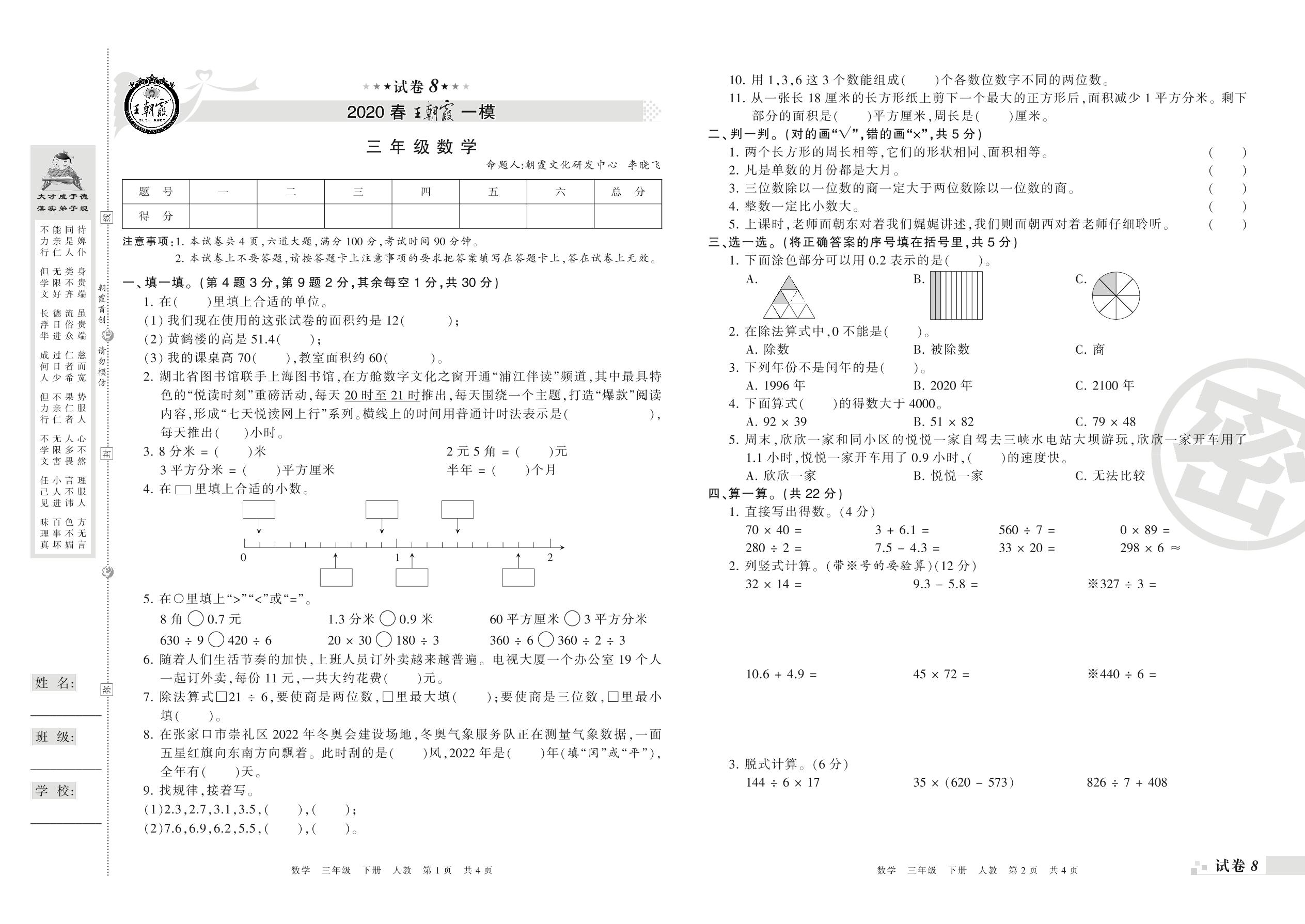 王朝霞期末模拟卷三年级下册数学(人教版)_R21080493354【8】